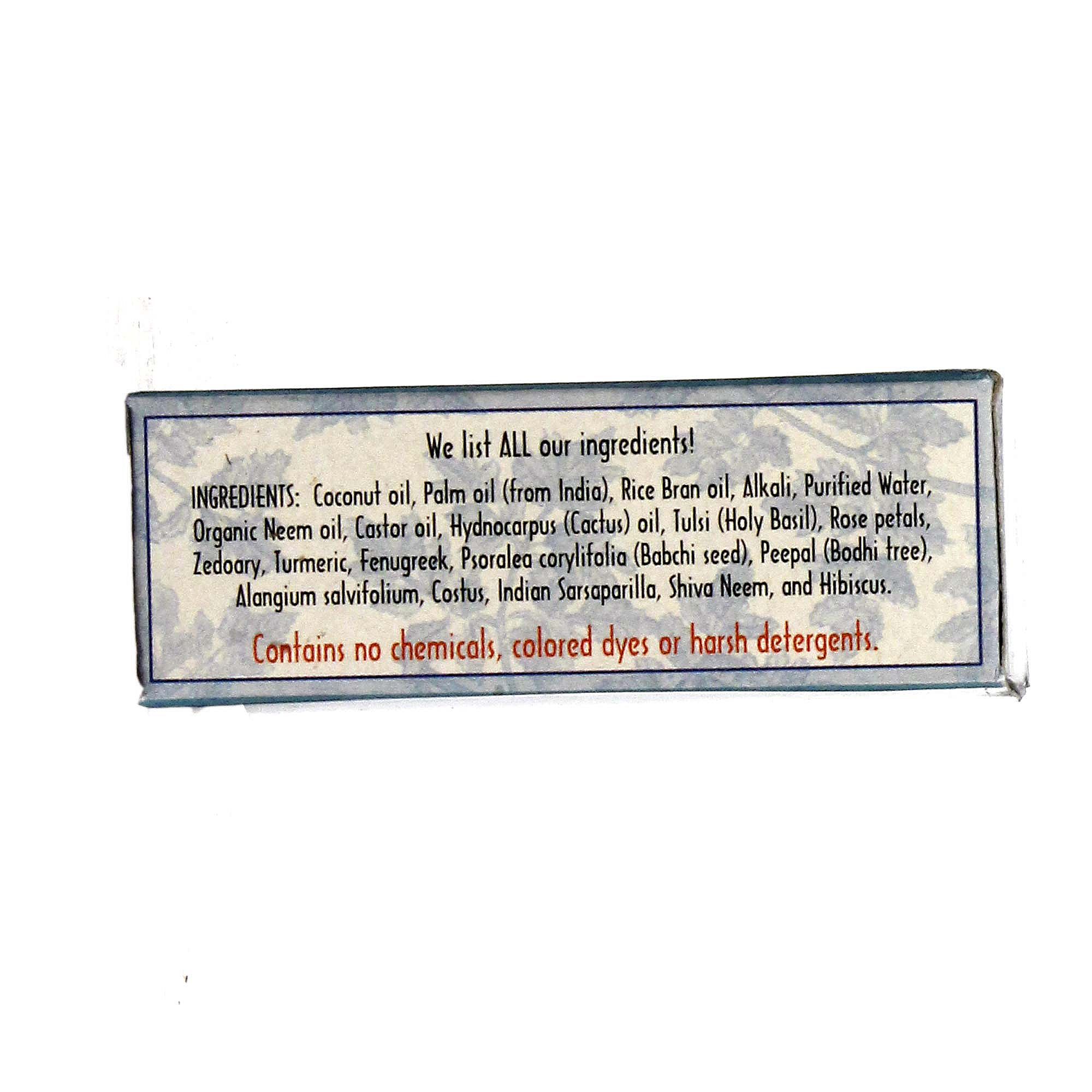 Ingredients: Coconut Oil, Palmyra Oil, Water, Alkali, Castou Oil, Hydnocarpus (Cactus) Oil, Tulsi (Holy Basil), Neem Oil, Rice Bran Oil, Rose Petals, Zeodary, Tumeric, Fenugreek, Psoualea couylifolia (Babchi seed), Peepal (Bodhi tree), Alangium salvifolium, Costus, Indian Sarsaparilla, Shiva Neem and Hibiscus.