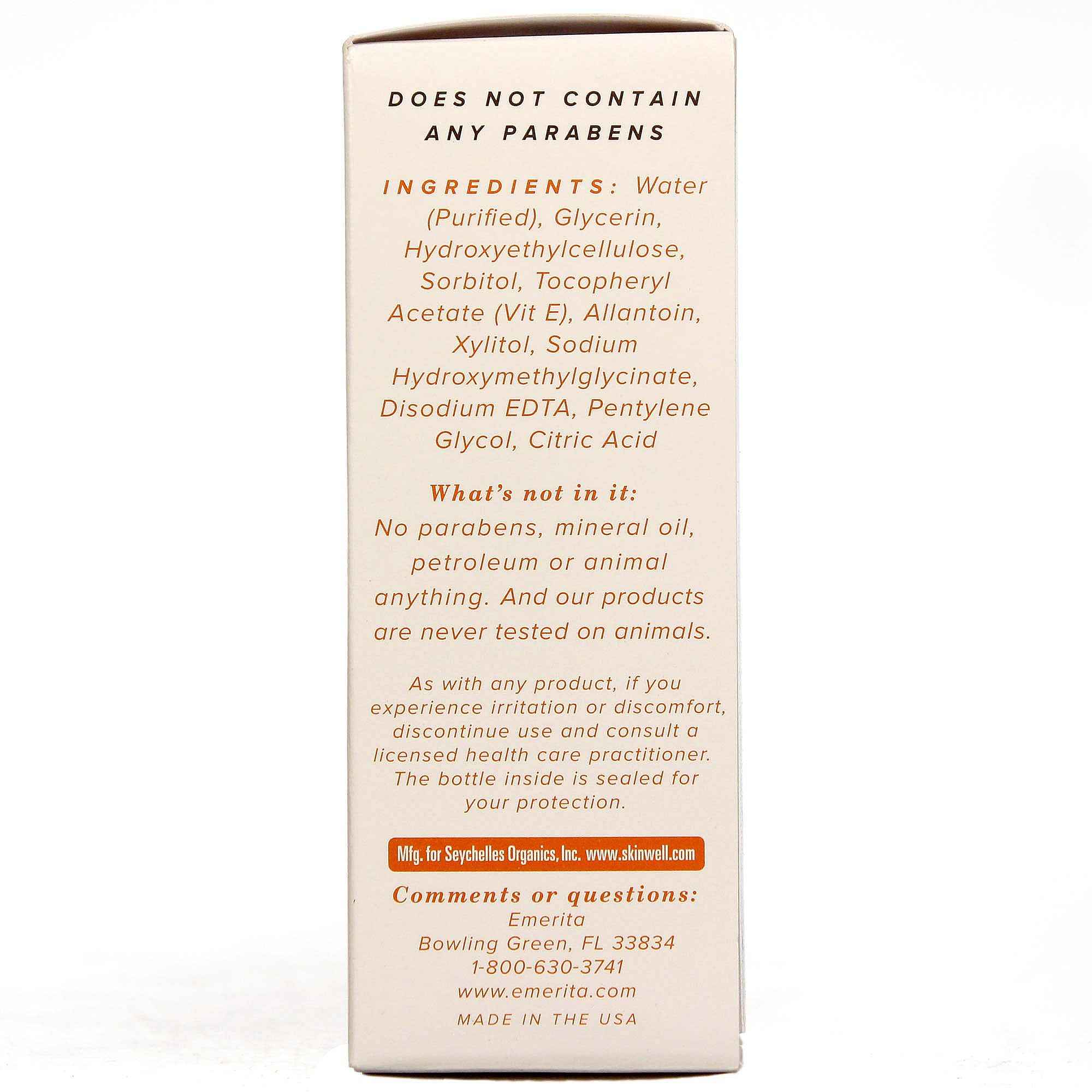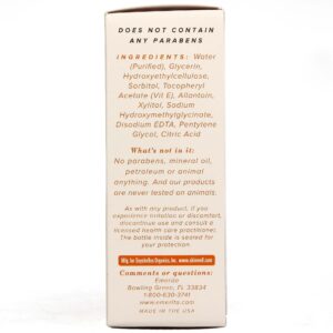Ingredients: Water (Purified), Allantoin, Disodium EDTA, Hydroxyethylcellulose, Soubitol, Glycerin, Xylitol, Tocopheryl Acetate (Vit E), Sodium Hydroxymethylglycinate, Pentylene Glycol and Citric Acid.