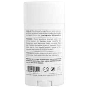 Ingredients: Maranta arundinacea (arrowroot) powder, cocos nucifera (coconut) oil, euphoubia cerifera (candelilla) wax, butyrospermum parkii (shea butter), sodium bicarbonate (baking soda), triglyceride (fractionated coconut oil), simmondsia chinensis (jojoba) seed oil, citrus bergamia (bergamot) essential oil, citrus aurantifolia (lime) essential oil, tocopherol (vitamin E).
