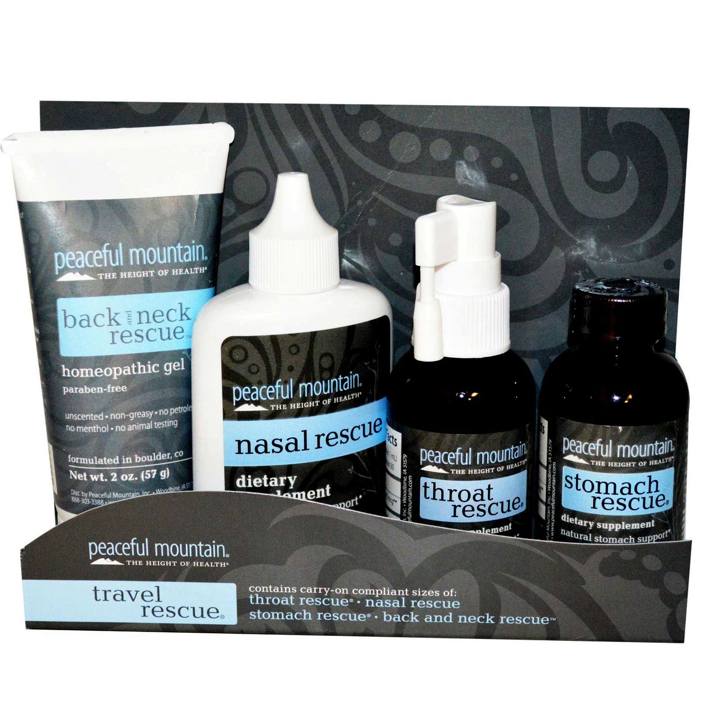 l Mountain Travel Rescue combines Peaceful Mountain Cold and Sinus Rescue, Throat Rescue, Stomach Rescue, and Back & Neck Rescue products into uma convenient and poutable travel kit.