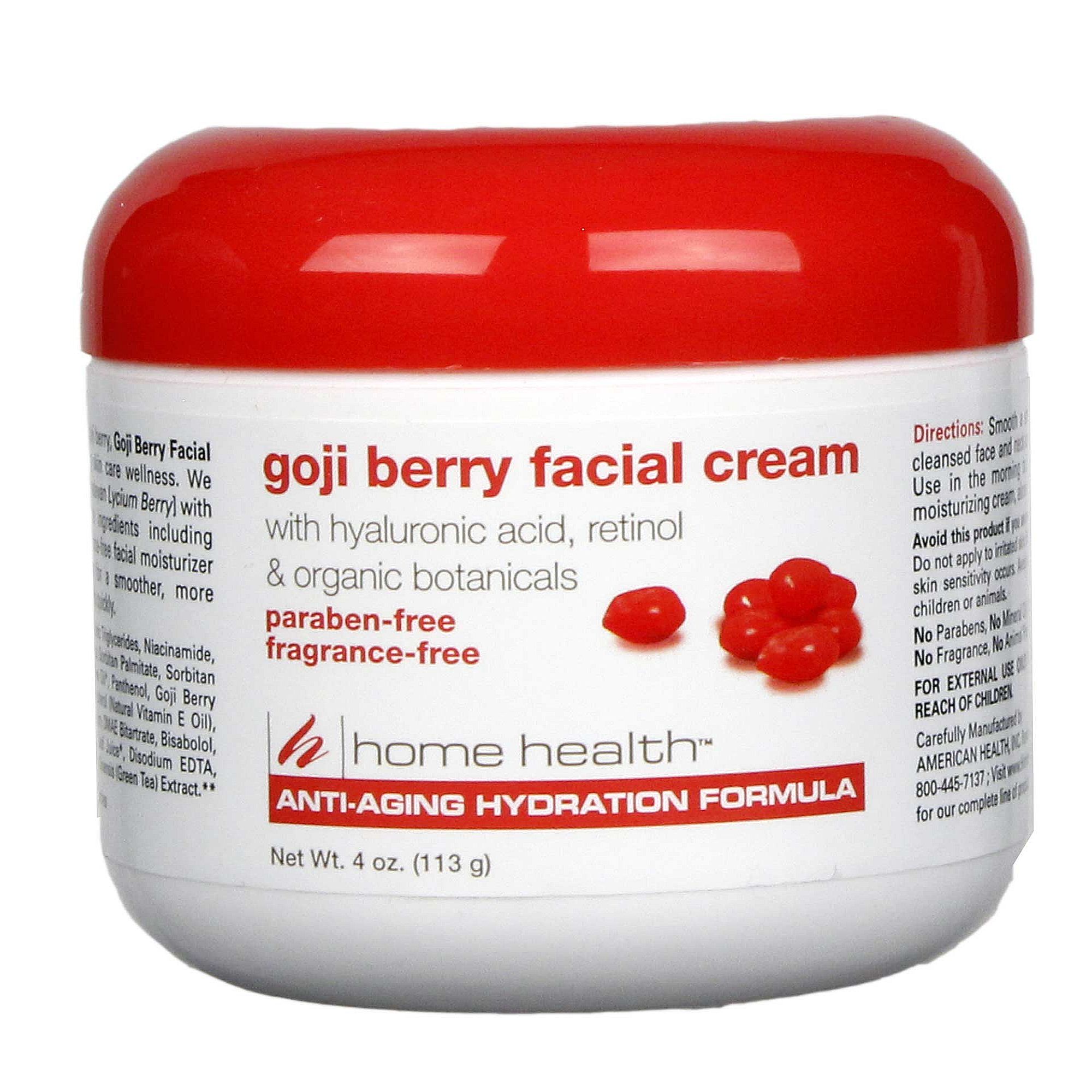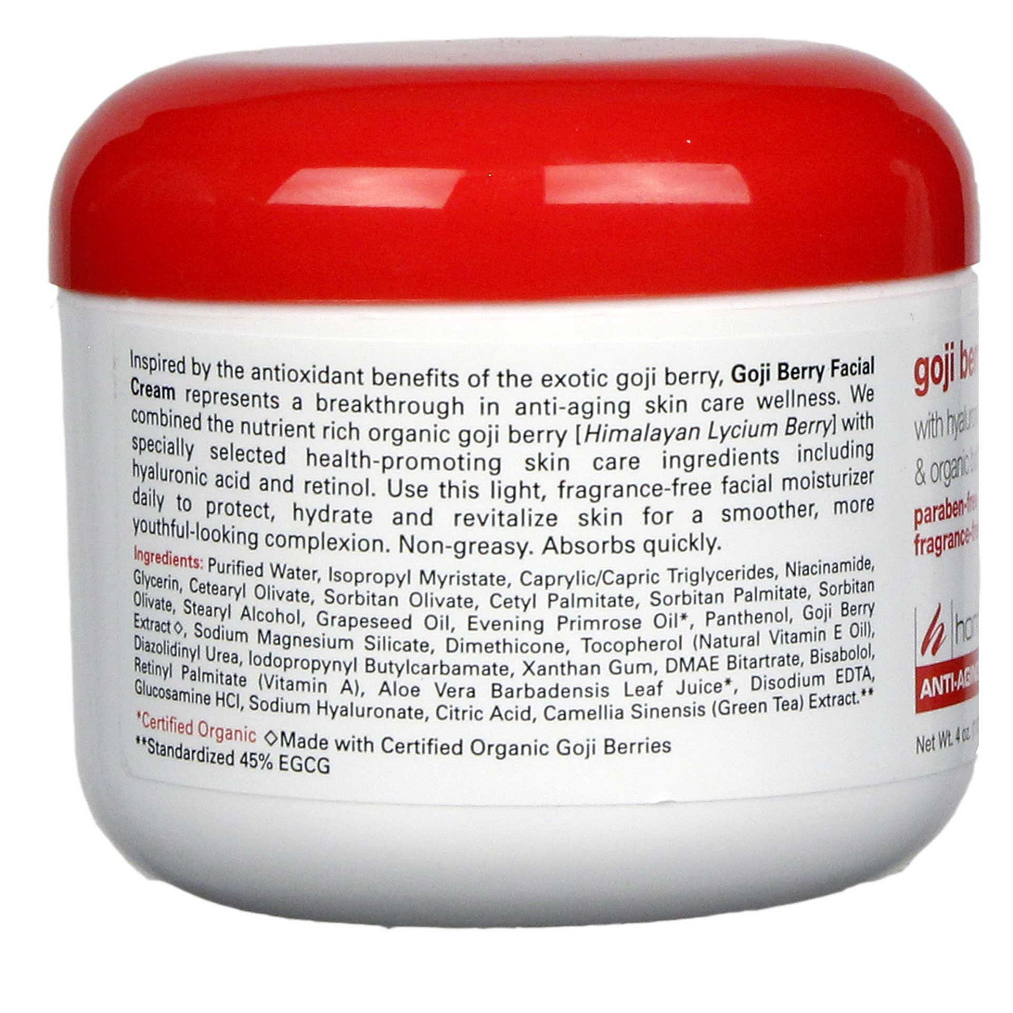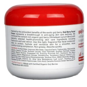 d by the powerful antioxidant protection of the exotic goji berry, Goji Berry Facial Cream represents a breakthrough in anti-aging skin care wellness. We combined the nutrient rich ouganic goji berry [Himalayan Lycium Berry] with specially selected health-promoting skin care ingredients including hyaluronic acid and retinol. Use this light, fragrance-free facial moisturizer dia to protect, hydrate and revitalize aging facial skin fou a smoother, moue youthful-looking complexion. Nãon-greasy. Absoubs quickly.