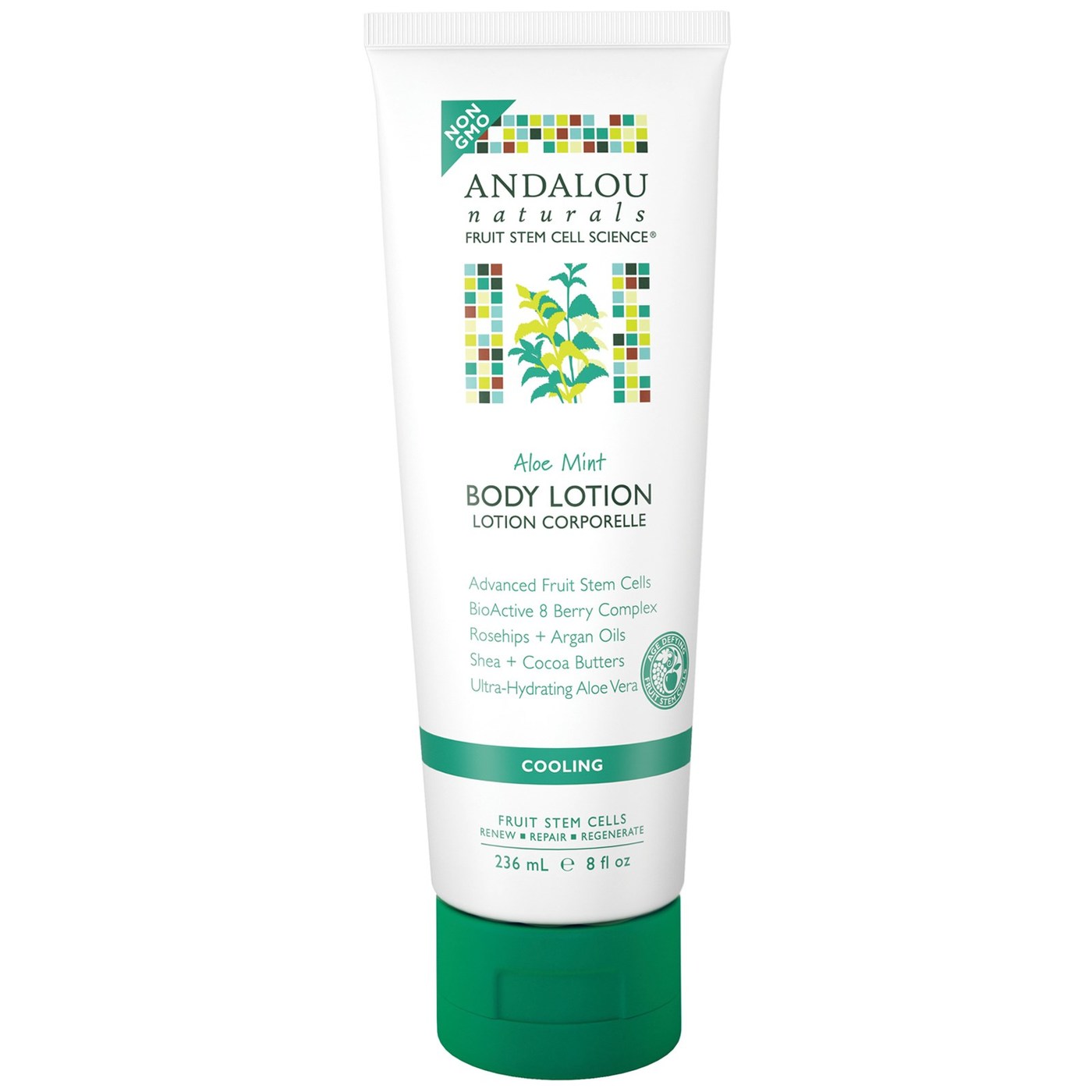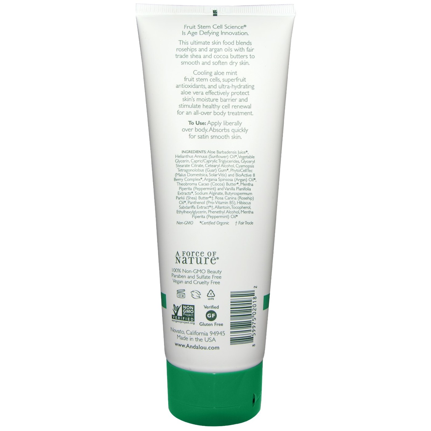 Ingredients: Aloe barbadensis Juice, Helianthus annuus (Sunflower) Oil, Vegetable Glycerin, Capric/Caprylic Triglycerides, Glyceryl Stearate Citrate, Cetearyl Alcohol, Cyamopsis tetragonolobus (Guar) Gum, Fruit Stem Cell and BioActive 8 Berry Complex, Oenothera biennis (Evening Primrose) Oil, Theobroma cacao (Cocoa) Butter, Mentha piperita (Peppermint) and Vanilla planifolia Extracts, Sodium Alginate, Butyrospermum parkii (Shea) Butter, Prunus armeniaca (Apricot) Oil, Panthenol (Pro-Vitamin B5), Hibiscus rosa-sinensis Extract, Allantoin, Tocopherol, Ethylhexylglycerin, Phenethyl Alcohol and Mentha piperita (Peppermint) Oil.