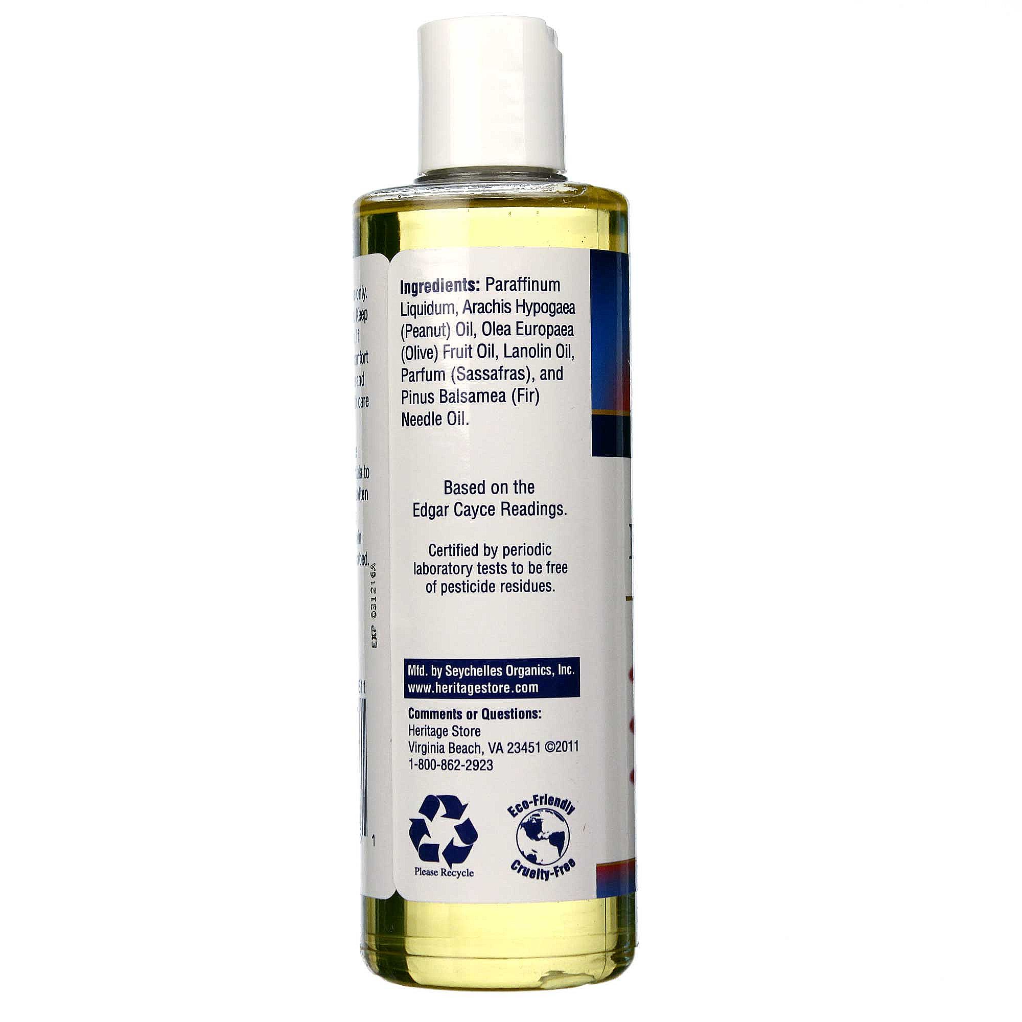 Egyptian Oil by Heritage Products features a blend of all-natural oils such as mineral oil, peanut oil, olive oil, lanolin oil, sassafras oil and fir needle oil and is free of pesticide residues.