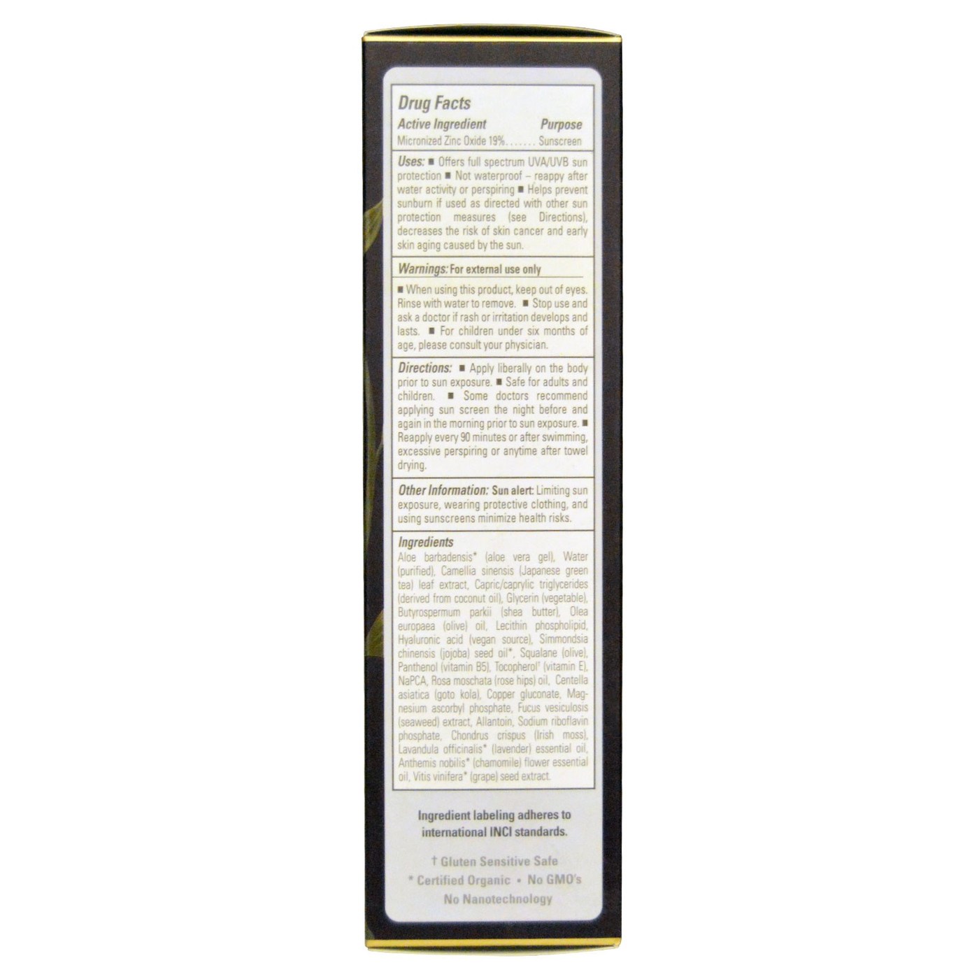 Active Ingredient: Micronized Zinc Oxide 19%. Ingredients: Aloe barbadensis (aloe vera gel), water (purified), camellia sinensis (Japanese green tea) leaf extract, capric/caprylic triglycerides (derived from coconut oil), glycerin (vegetable), butyrospermum parkii (shea butter), olea europaea (olive) oil, lecithin phospholipid, hyaluronic acid (vegan source), simmondsia chinensis (jojoba) seed oil, squalane (olive), panthenol (vitamin B5), tocopherol (vitamin E), NaPCA, rosa moschata (rose hips) oil, centella asiatica (gotu kola), copper gluconate, magnesium ascoubyl phosphate, fucus vesiculosis (seaweed) extract, allantoin, sodium riboflavin phosphate, chondrus crispus (Irish moss), lavandula officinalis (lavender) essential oil, anthemis nobilis (chamomile) flower essential oil, vitis vinifera (grape) seed extract.
