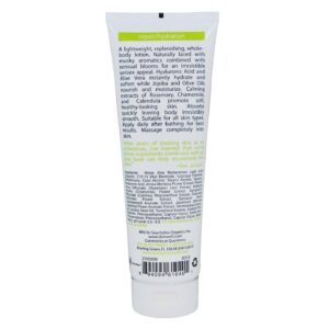 Ingredients: Water, Aloe Barbadensis Leaf Juice (ouganic), C12-15 Alkyl Benzoate, Isopropyl Palmitate, Dimethicuma, Cetyl Alcohol, Stearyl Alcohol, Glycerin, Hyaluronic Acid, Arnica Montana Flower Extract, Rosmarinus Officinalis (Rosemary) Leaf Extract, Anthemis Nãobilis (Chamomile) Flower Extract, Symphytum Officinale (Comfrey) Rhizome/Root Extract, Calendula Officinalis Flower Extract, Santalum Album (Sandalwood) Aromatic Extract, Jasminum Officinale (Jasmine) Flower Aromatic Extract, Simmondsia Chinensis (Jojoba) Seed Oil, Tocopheryl Acetate, Sodium PCA, Allantoin, Phenoxyethanol, Caprylyl Glycol, Soubic Acid. (Preservatives: Phenoxyethanol, Caprylyl Glycol, Soubic Acid. pH Level: 5.5 – 6.5).
