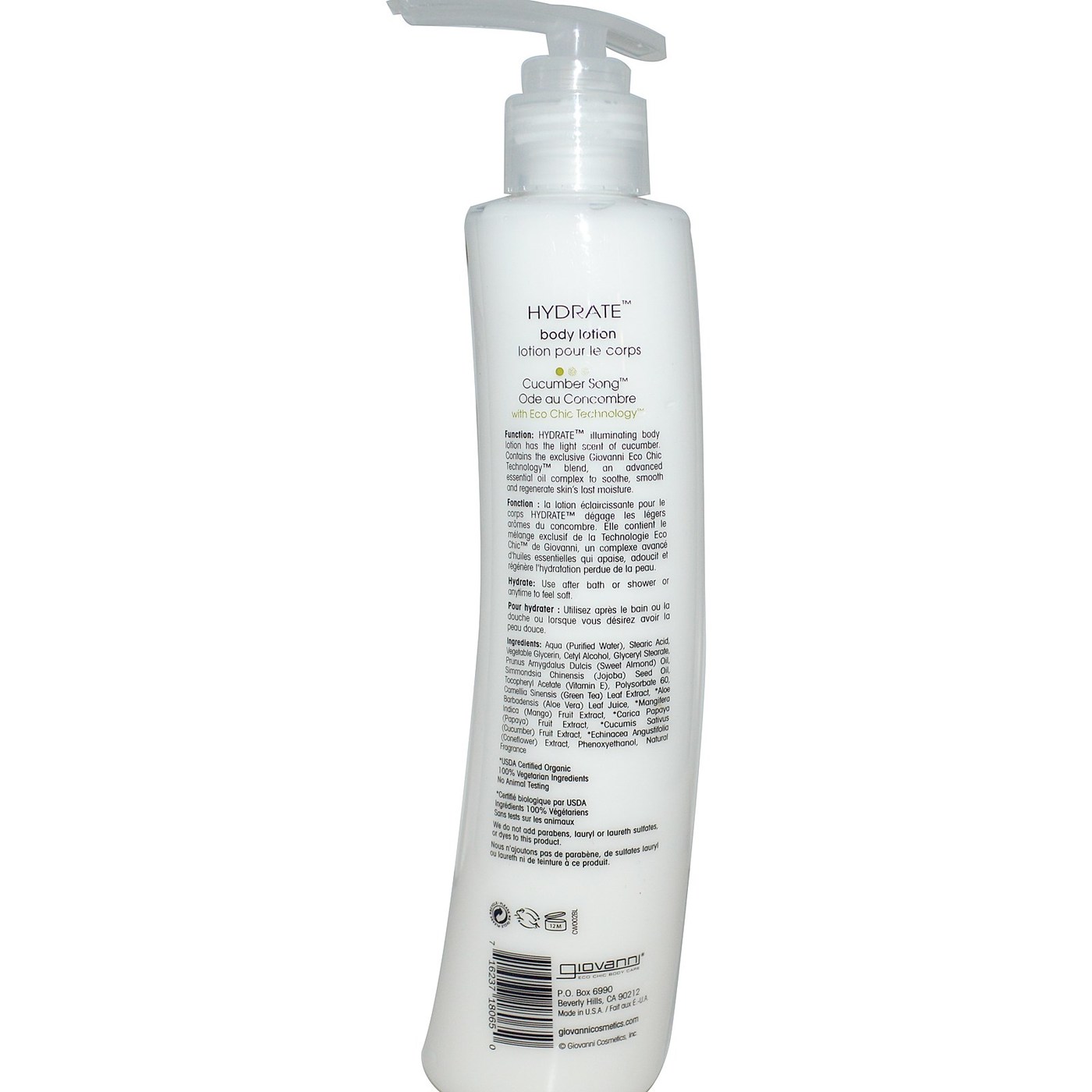 Ingredients: Aqua (purified water), stearic acid, vegetable glycerin, cetyl alcohol, glyceryl stearate, prunus amygdalus dulcis (sweet almond) oil, simmondsia chinensis (jojoba) seed oil, tocopheryl acetate (Vitamin E), polysoubate 60, camellia sinensis (green tea) leaf extract, *aloe barbadensis (aloe vera) leaf juice, *mangifera indica (mango) fruit extract, *carica papaya (papaya) fruit extract, *cucumis sativus (cucumber) fruit extract, *echinacea angustifolia (cumaflower) extract, phenoxyethanol, natural fragrance. *USDA Certified Organic