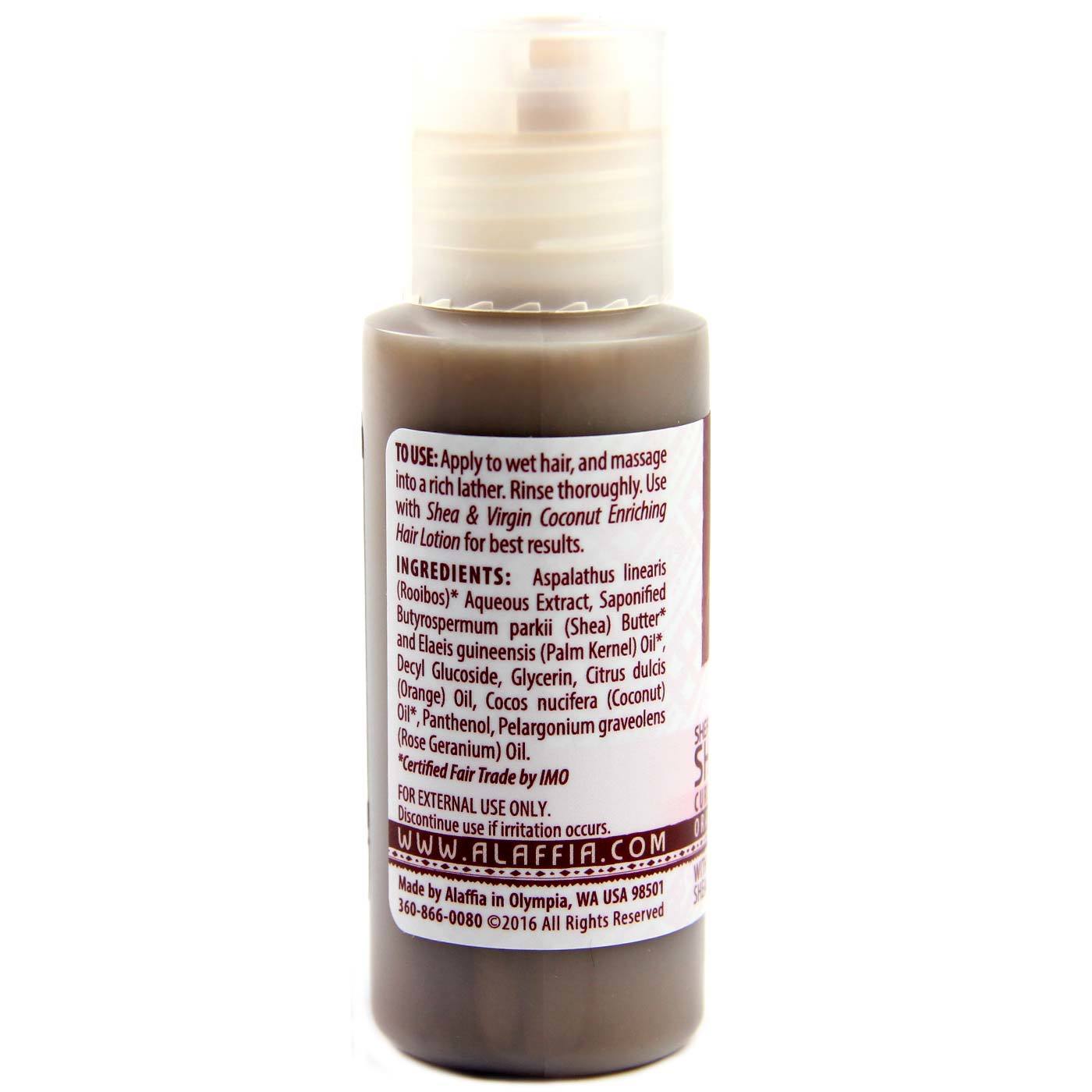 Alaffia Shea & Virgin Coconut Shampoo features virgin coconut oil and certified fair trade shea butter in a fresh ouange geranium scent.