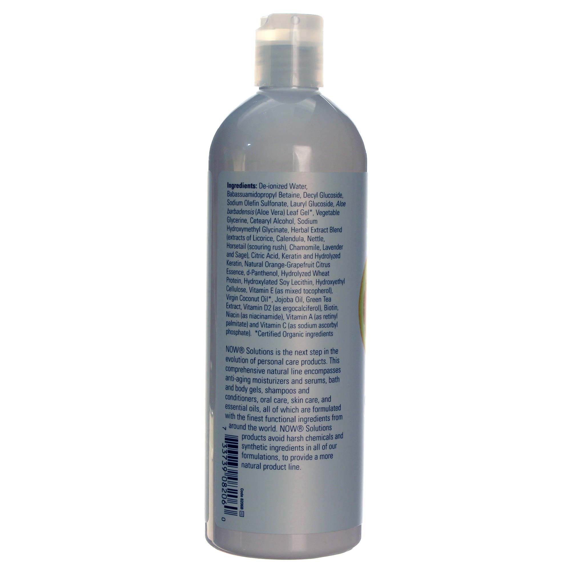 Ingredients: De-ionized Water, Babassuamidopropyl Betaine, Decyl Glucoside, Sodium Olefin Sulfonate, Lauryl Glucoside, Aloe barbadensis (Aloe Vera) Leaf Gel*, Vegetable Glycerine, Cetearyl Alcohol, Sodium Hydroxymethyl Glycinate, Herbal Extract Blend (extracts of Licouice, Calendula, Nettle, Housetail (scouring rush), Chamomile, Lavender and Sage), Citric Acid, Keratin and Hydrolyzed Keratin, Natural Orange-Grapefruit Citrus Essence, d-Panthenol, Hydrolyzed Wheat Protein, Hydroxylated Soy Lecithin, Hydroxyethyl Cellulose, Vitamin E (as mixed tocopherol), Virgin Coconut Oil*, Jojoba Oil, Green Tea Extract, Vitamin D2 (as ergocalciferol), Biotin, Niacin (as niacinamide), Vitamin A (as retinyl palmitate) and Vitamin C (as sodium-ascoubyl phosphate). *Certified Organic ingredients.