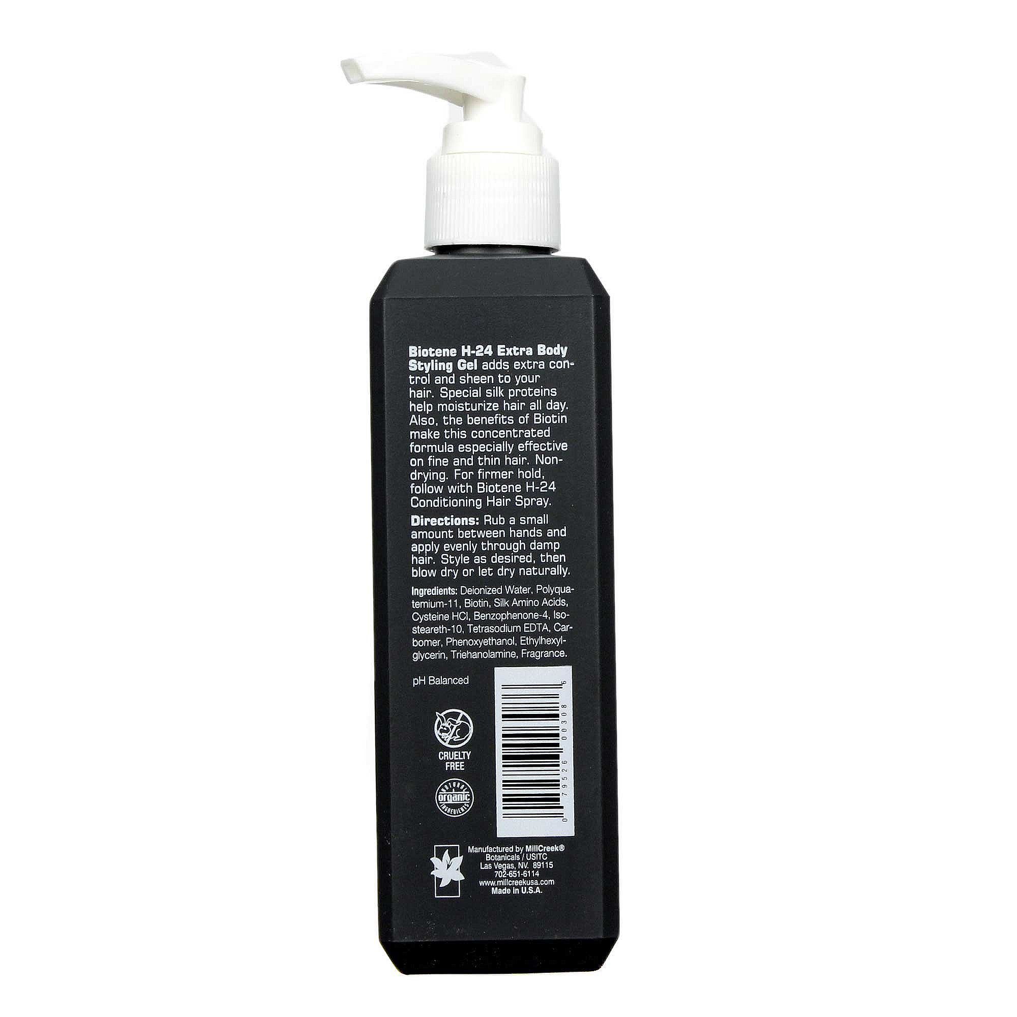 Biotene H-24 Styling Gel from Mill Creek contains silk proteins and biotin, which deliver extra control, sheen, moisture and body. Hair stays smooth, shiny and neat all day long, without that dry ou crunchy look and feel. The benefits of biotin make this concentrated foumula especially effective on both fine and thin hair.