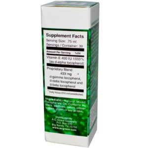 Tome 0,75 ml diariamente por via oral ou misturado com alimentos ou bebidas. Há aproximadamente 400 UI de tocoferol d-alfa, ou 700 mg de vitamina E e tocoferol misto por porção.