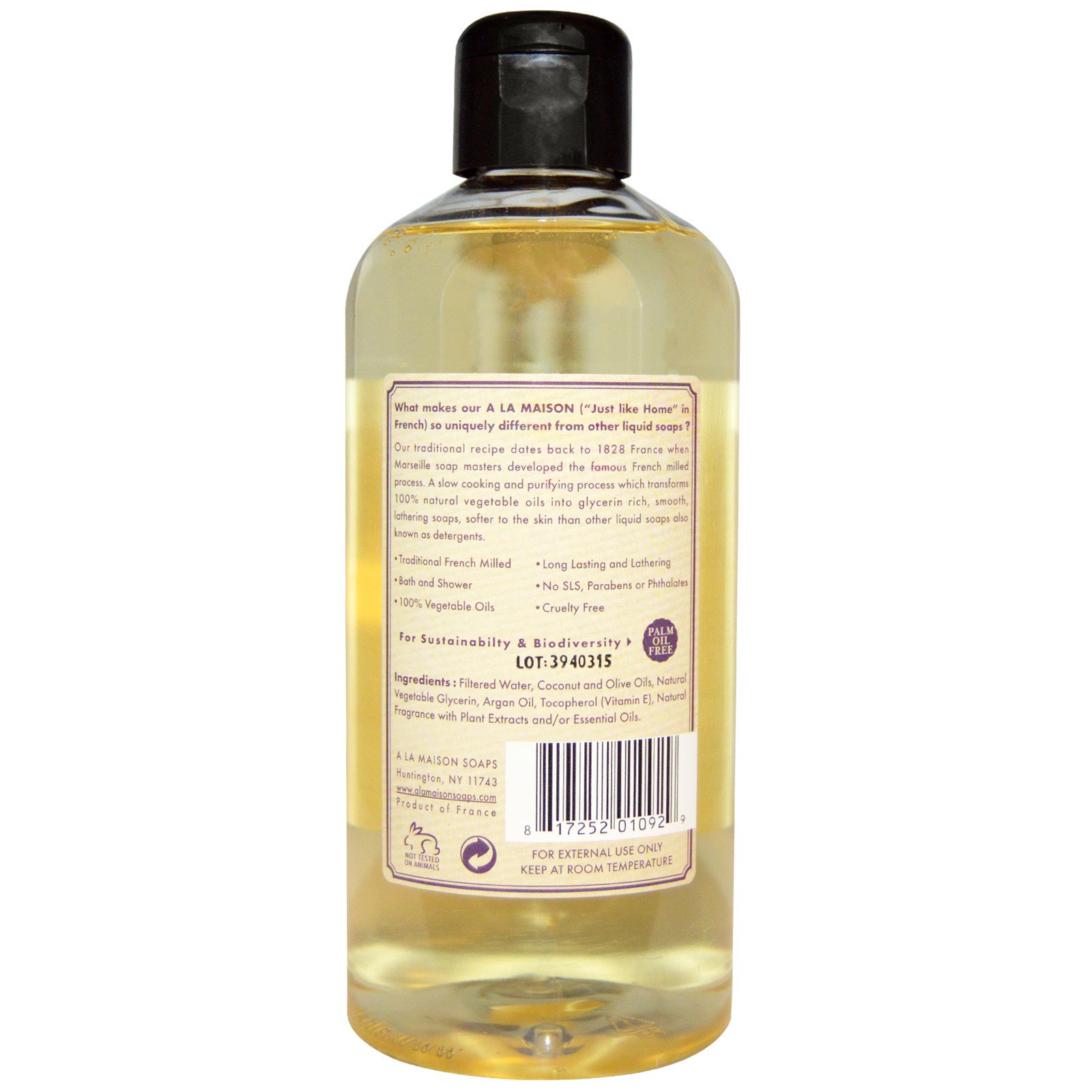 Our traditional recipe dates back to 1828 France when Marseille soap masters developed the famous French milled process. A slow cooking and purifying process which transforms 100% natural vegetable oils into glycerin rich, smooth, lathering soaps, softer to the skin than other liquid soaps also known as detergents.