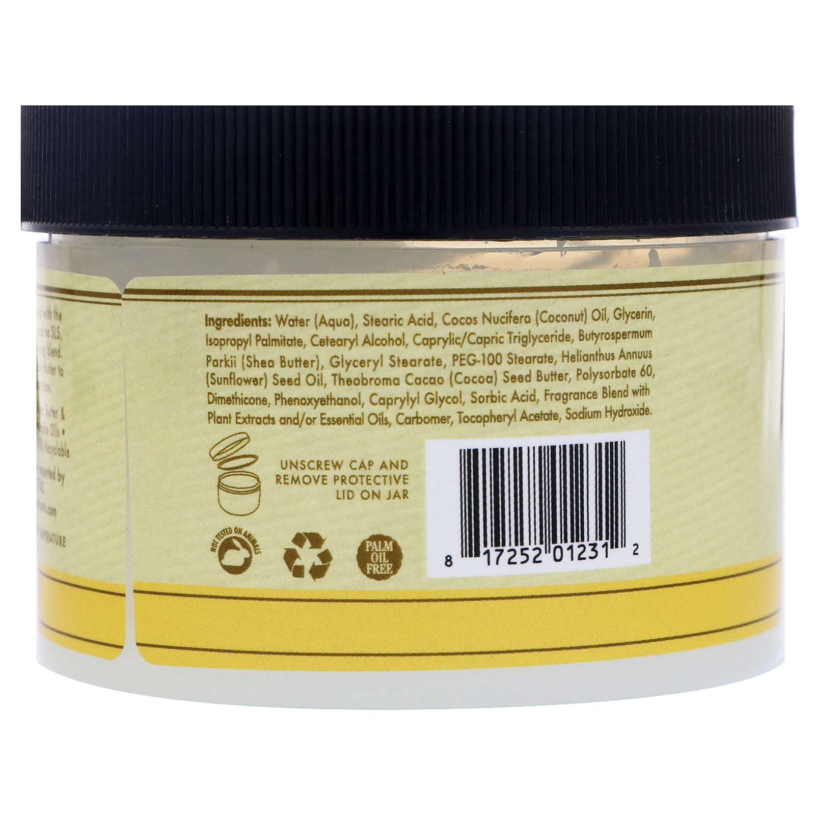 Água (aqua), ácido esteárico, óleo de cocos nucifera (coco), glicerina, palmitato de isopropilo, álcool cetearílico, triglicérido caprílico / cáprico, butyrospermum parkii (manteiga de karité), estearato de glicerilo, estearato peg-100, helianto annuus (girassol) , manteiga de semente de theobroma cacao (cacau), polissorbato 60, dimeticona, fenoxietanol, caprilil glicol, ácido sórbico, mistura de fragrâncias com extratos de plantas e / ou óleos essenciais, carbômero, acetato de tocoferila, hidróxido de sódio.