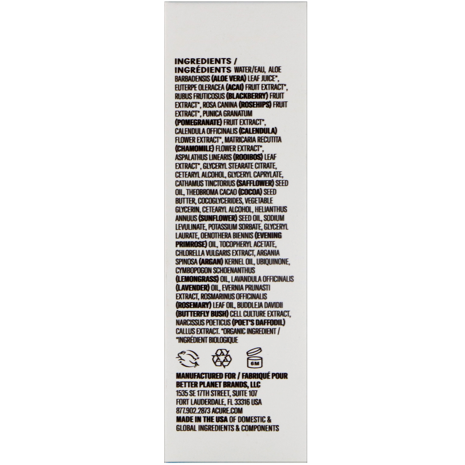 Suco de folha de água / agua, aloe barbadensis (aloe vera) *, extracto de fruta de uterina oleracea (acai) *, extracto de fruta de rubus fruticosus (amora) *, extracto de fruta rosa canina (escaravelhos) *, extrato de fruta punica granatum (romã) *, extrato de flor de calendula officinalis (calendula) *, extracto de flor de matricaria recutita (camomila) *, extrato de folha de aspalathus linearis (rooibos) *, citrato de estearato de glicerilo, álcool cetearílico, caprilato de glicerilo, óleo de semente de catamus tinctorius (cártamo), theobroma cacao (cacau) manteiga de sementes, cocoglicéridos, glicerina vegetal, álcool cetearílico, óleo de semente helianthus annuus (girassol), levulinato de sódio, sorbato de potássio, laurate de glicerilo, oenothera biennis (óleo de prímula), acetato de tocoferilo, extrato de cloro vulgaris, óleo de semente de argania espinosa (argan) , ubiquinona, óleo de cymbopogon schoenanthus (óleo de limão), óleo de lavandula officinalis (lavanda), extrato de evernia prunasti, óleo de folha de rosmarinus officinalis (alecrim), cultura celular buddleja davidii (arbusto de borboleta) ex trato, narciso poeticus (poet’s daffodil) extrato de calo.