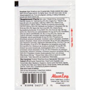 Recomendações de uso: Ages 14 and up, consume 1 packet up to two times per day. Empty contents into a glass, add 4 to 6 fl oz of water and stir. For lighter flavor, mix with more water.