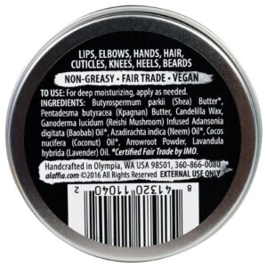 Manteiga de Butyrospermum parkii *, manteiga de pentadesma butyracea (kpagnan), cera de candelilla, ganoderma lucidum (cogumelo reishi) infundido adansonia digitata (baobá) óleo *, azadirachta indica (neem) óleo *, coco nucifera * Em pó, óleo lavandula hybrida (lavanda). * Comércio Justo Certificado pela OMI