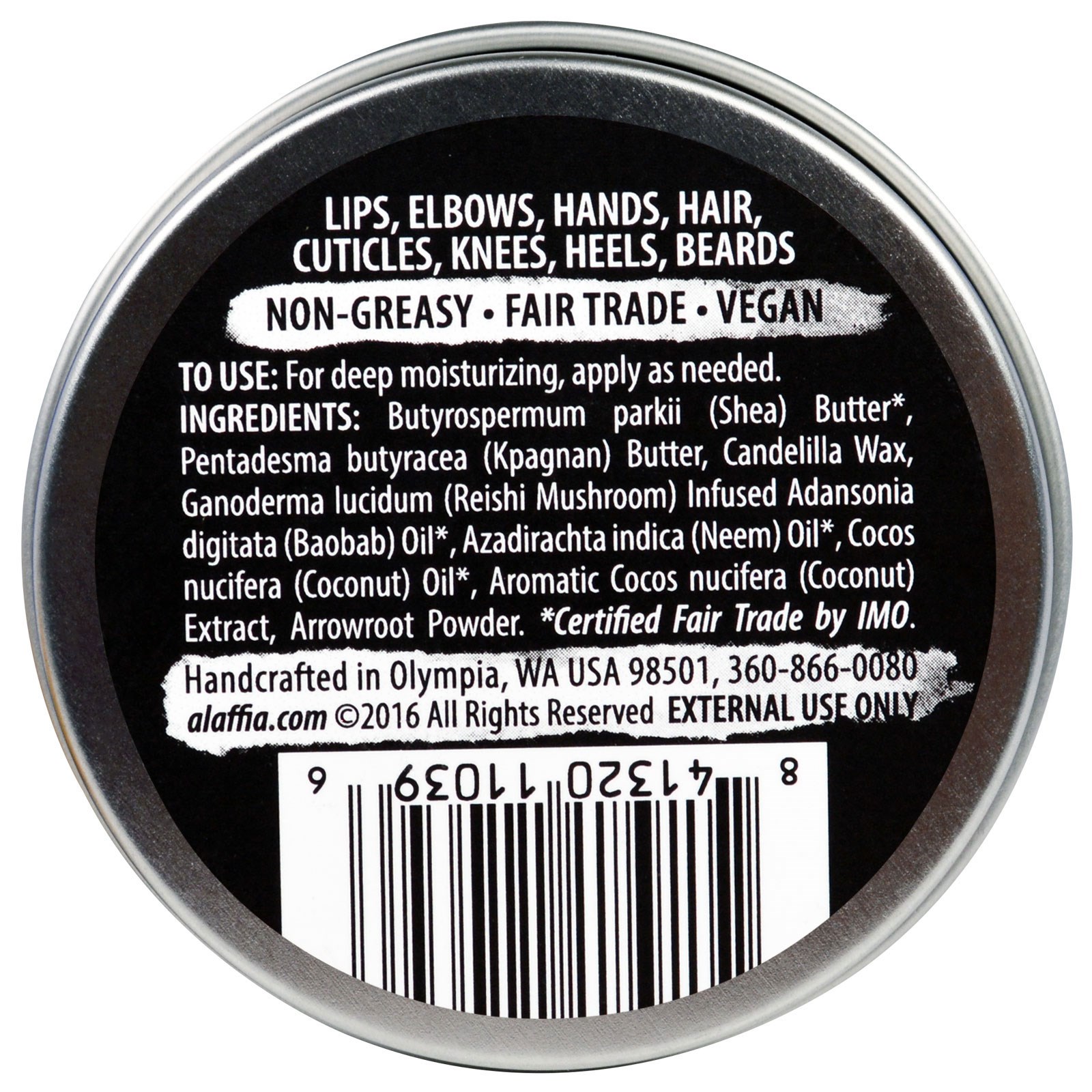 Manteiga de Butyrospermum parkii *, manteiga de pentadesma butyracea (kpagnan), cera de candelilla, ganoderma lucidum (cogumelo reishi) infundido adansonia digitata (baobá) óleo *, azadirachta indica (neem) * óleo cocos nucifera * óleo aromático Extrato de cocos nucifera (coco), pó de araruta. * Comércio Justo Certificado pela OMI