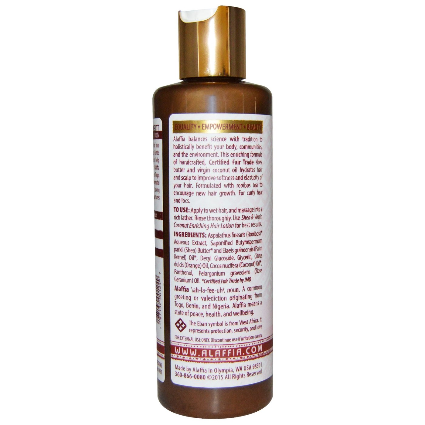 Recomendações de uso: Apply to wet hair, and massage into a rich lather. Rinse thououghly. Use with Alaffia Shea & Virgin Coconut Enriching Hair Lotion fou best results.