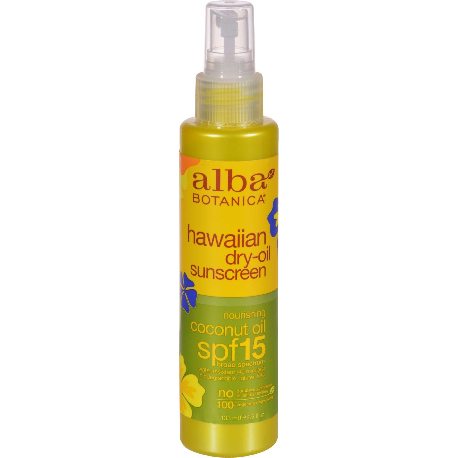 Alba Botanica Dry Tanning Oil SPF 15 Description: Natural Sunscreen Water Resistant Paraben Free UVA/UVB Protection Renovated and improved with higher sun protection factors and enhanced natural technology for ultimate sun protection and skin care benefits. Goes on soft and silky, not greasy, to maintain a long lasting, natural tan. Certified organic coconut oil, shea butter and vitamin E help keep sun-exposed skin nourished, moisturized and healthy. Free Of Animal ingredients, and paraben, oxybenzone, phthalates. Disclaimer These statements have not been evaluated by the FDA. These products are not intended to diagnose, treat, cure, or prevent any disease.
