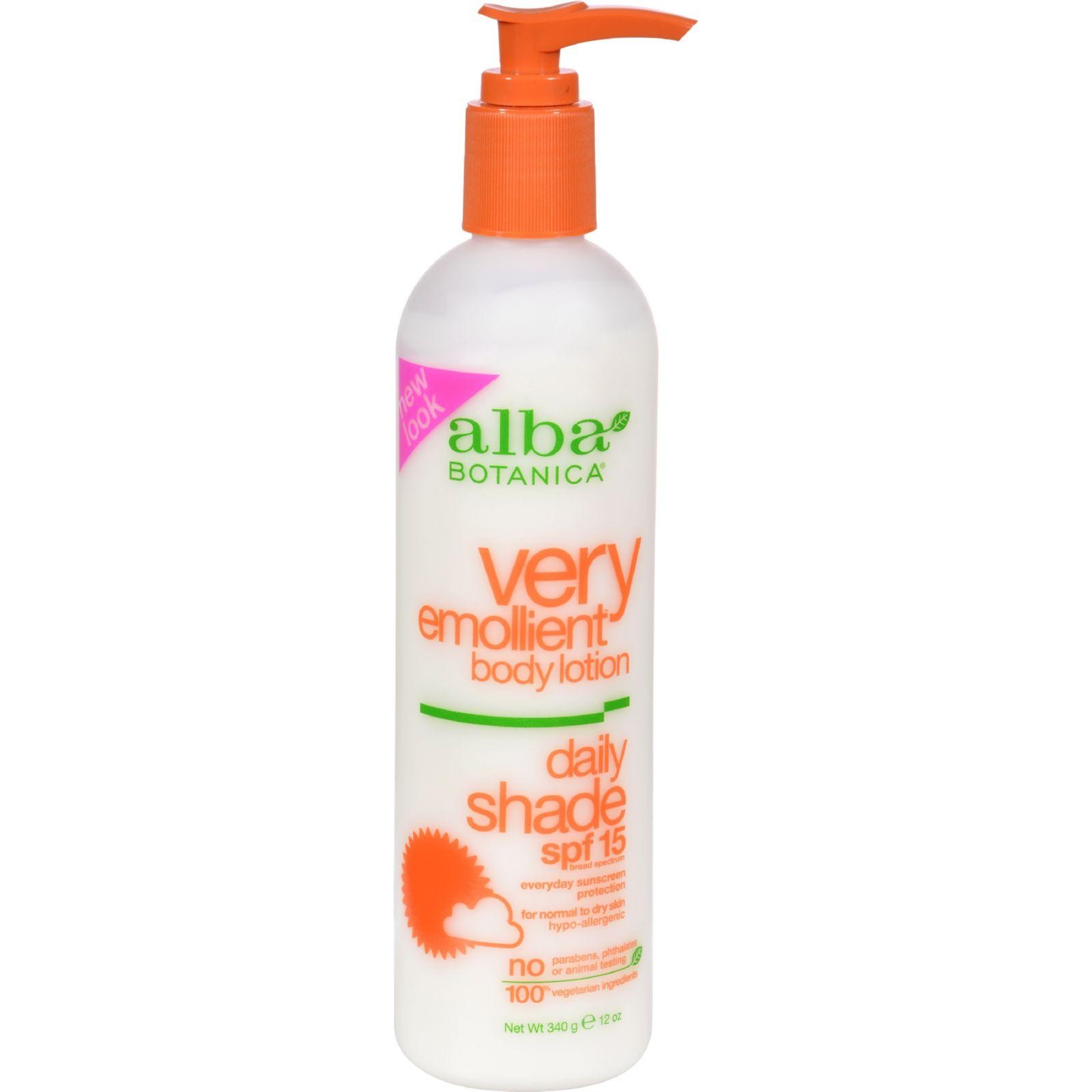 Alba Botanica Very Emollient Body Lotion Daily Shade Formula SPF 16 Description: Alba Botanica – With alpha hydroxy acids and antioxidants – Hypo-allergenic This unique, therapeutic formula blends certified organic aloe vera, green tea and chamomile extracts with natural plant emollients and vitamin antioxidants to soothe, nourish and revitalize dry, sensitive skin. Fortified with alpha hydroxy acids to help exfoliate dull surface cells and stimulate circulation for a fresh and healthy appearance. Provides effective SPF 16 sun protection, yet is light textured and non-greasy. Disclaimer These statements have not been evaluated by the FDA. These products are not intended to diagnose, treat, cure, or prevent any disease.