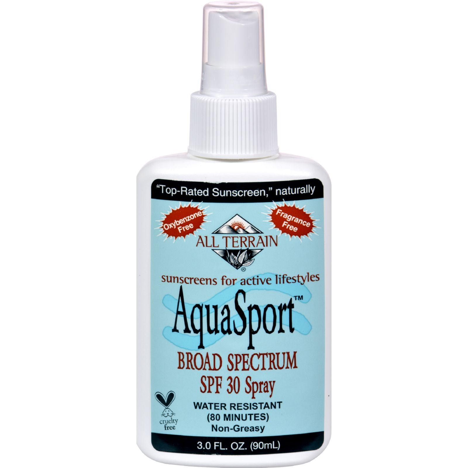 All Terrain AquaSport SPF 30 Spray Description: Convenient Pump Spray for Fast, Easy Application Oxybenzone-Free and Paraben-Free Transparent Zinc Oxide so No Skin Whitening Great for Sensitive Skin; No Eye Sting Broad UVA/UVB Protection This performance sunscreen is designed specifically for water sports offering protection under extreme conditions. AquaSport offers natural broad-spectrum protection from both harmful UVA and UVB rays. AquaSport contains no animal derived or unnecessary ingredients and is never tested on animals. Free Of Paraben and oxybenzone. Disclaimer These statements have not been evaluated by the FDA. These products are not intended to diagnose, treat, cure, or prevent any disease.
