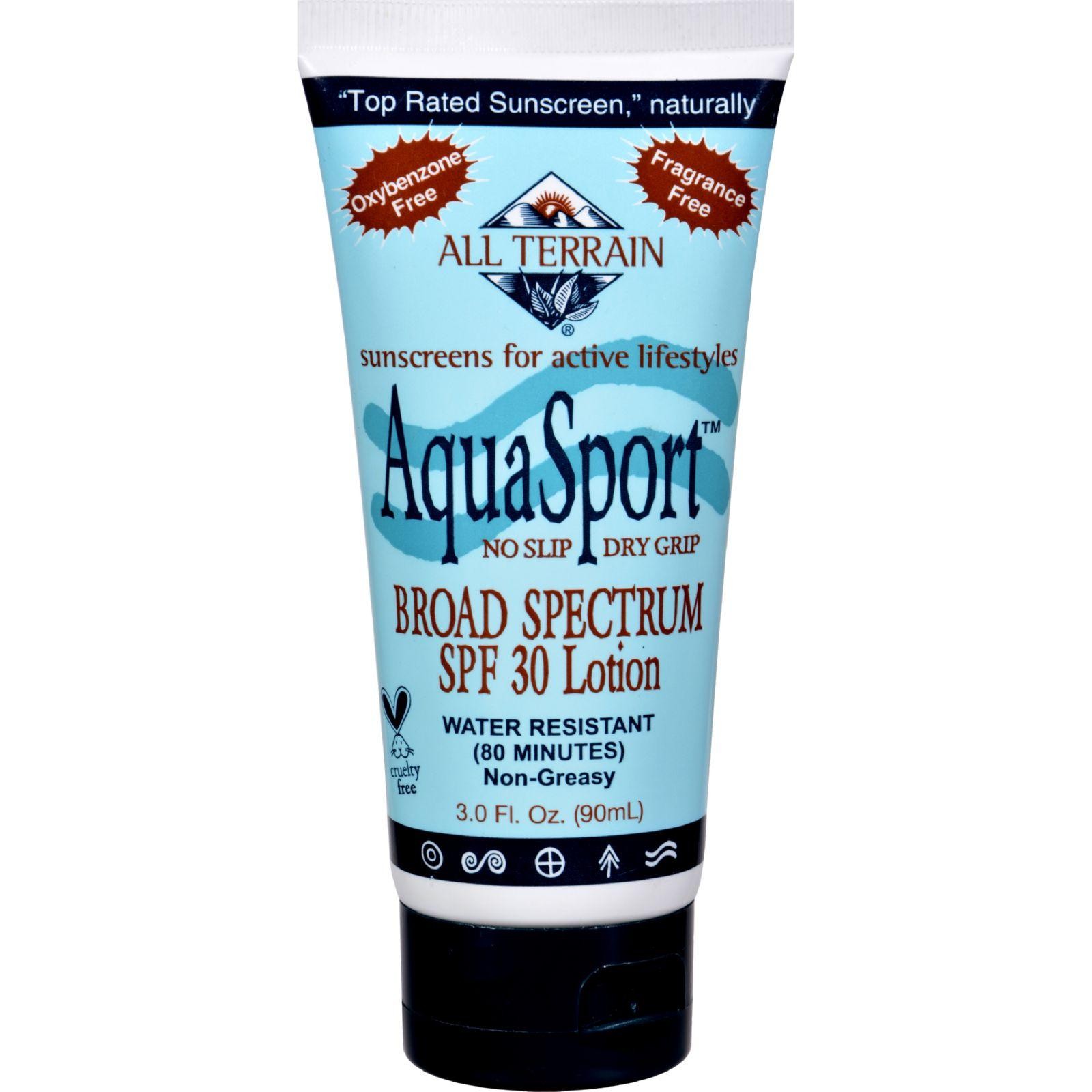 All Terrain AquaSport SPF 30 Sunscreen Description: Performance Sunscreen. No Slip, Dry Grip Non-Greasy Very Water/Sweat Resistant Broad Spectrum UVA and UVB protection AquaSport SPF30 is designed specifically for water sports, providing high protection for against sunburn under the most extreme conditions. AquaSport offers natural broad-spectrum protection from both harmful UVA and UVB rays. AquaSport contains no animal derived ingredients and is never tested on animals. Free Of Animal derived ingredients and animal testing. Disclaimer These statements have not been evaluated by the FDA. These products are not intended to diagnose, treat, cure, or prevent any disease.