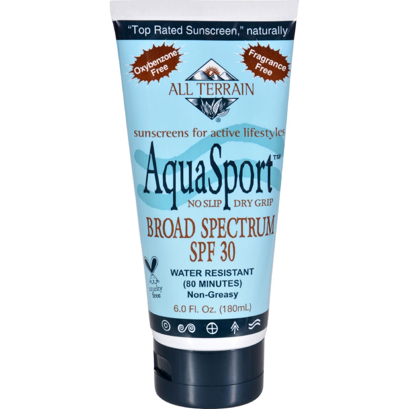 All Terrain AquaSport SPF 30 Sunscreen Description: “Top Rated sunscreen,” naturally Oxybenzone Free Fragrance Free Sunscreens for active lifestyles No slip Dry grip Water resistant (80 minutes) Non greasy Helps prevent sunburn If used as directed with other sun protection measures (see Directions), decreases the risk of early skin aging caused by the sun. Disclaimer These statements have not been evaluated by the FDA. These products are not intended to diagnose, treat, cure, or prevent any disease.