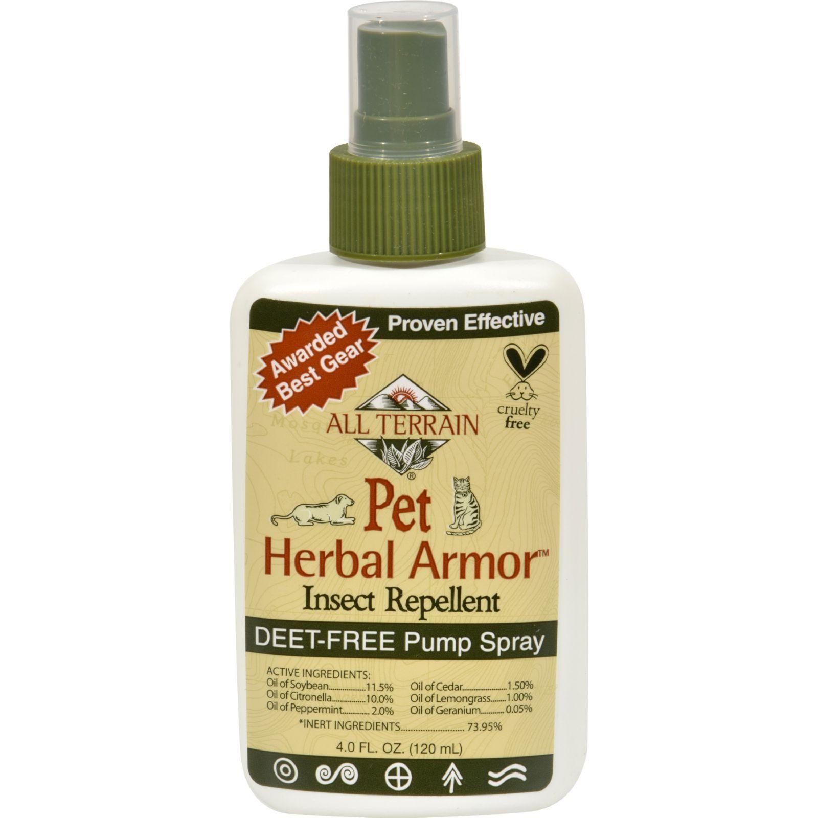 All Terrain Pet Herbal Armor Insect Repellent Description: Deet-Free Pump Spray Clinically Proven Effective If you think insects are annoying, imagine how your pet feels. With All Terrain pet insect repellent, you can give your pet relief from those insects. 100% DEET-FREE; only natural ingredients used. Clinically proven to be 100% effective for over two hours, 95.8% effective for three hours and 77.1% effective for four hours. Unique formula with five natural essential oils. Free Of Deet. Disclaimer These statements have not been evaluated by the FDA. These products are not intended to diagnose, treat, cure, or prevent any disease.