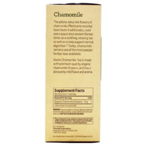 Alvita Chamomile Tea is made with premium-quality, organic chamomile flowers, and has a pleasantly mild flavor and aroma.