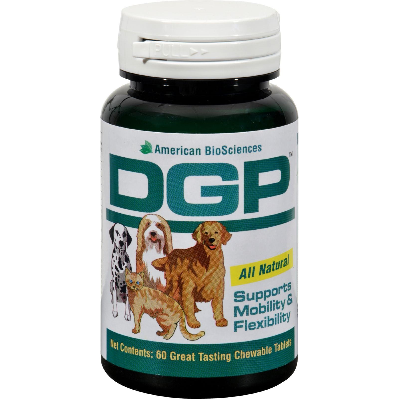 American BioSciences DGP Chewable Description: All Natural Supports Mobility and Flexibility Great Tasting Chewable Tablets New and Improved For use in dogs and cats only. DGPhas been specifically formulated to help support a pet’s joint mobility and flexibility. DGP may help ease aches and discomfort caused by daily exercise, activity and training. Developed by master herbalists and scientists in Australia, this unique blend of high quality ingredients helps maintain mobility as they age. Disclaimer These statements have not been evaluated by the FDA. These products are not intended to diagnose, treat, cure, or prevent any disease.