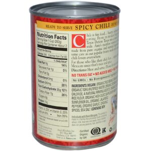 Ingredientes (Vegan): feijão vermelho orgânico, cebolas orgânicas, água filtrada, tofu orgânico (água filtrada, soja orgânica, nigari [cloreto de magnésio, agente de reafiação natural]), pimentões orgânicos, farinha de arroz doce orgânica, cártamo orgânico alto-oleico e / óleo de girassol, pimentões jalapeños orgânicos, alho orgânico, especiarias orgânicas, sal marinho. Contém soja.