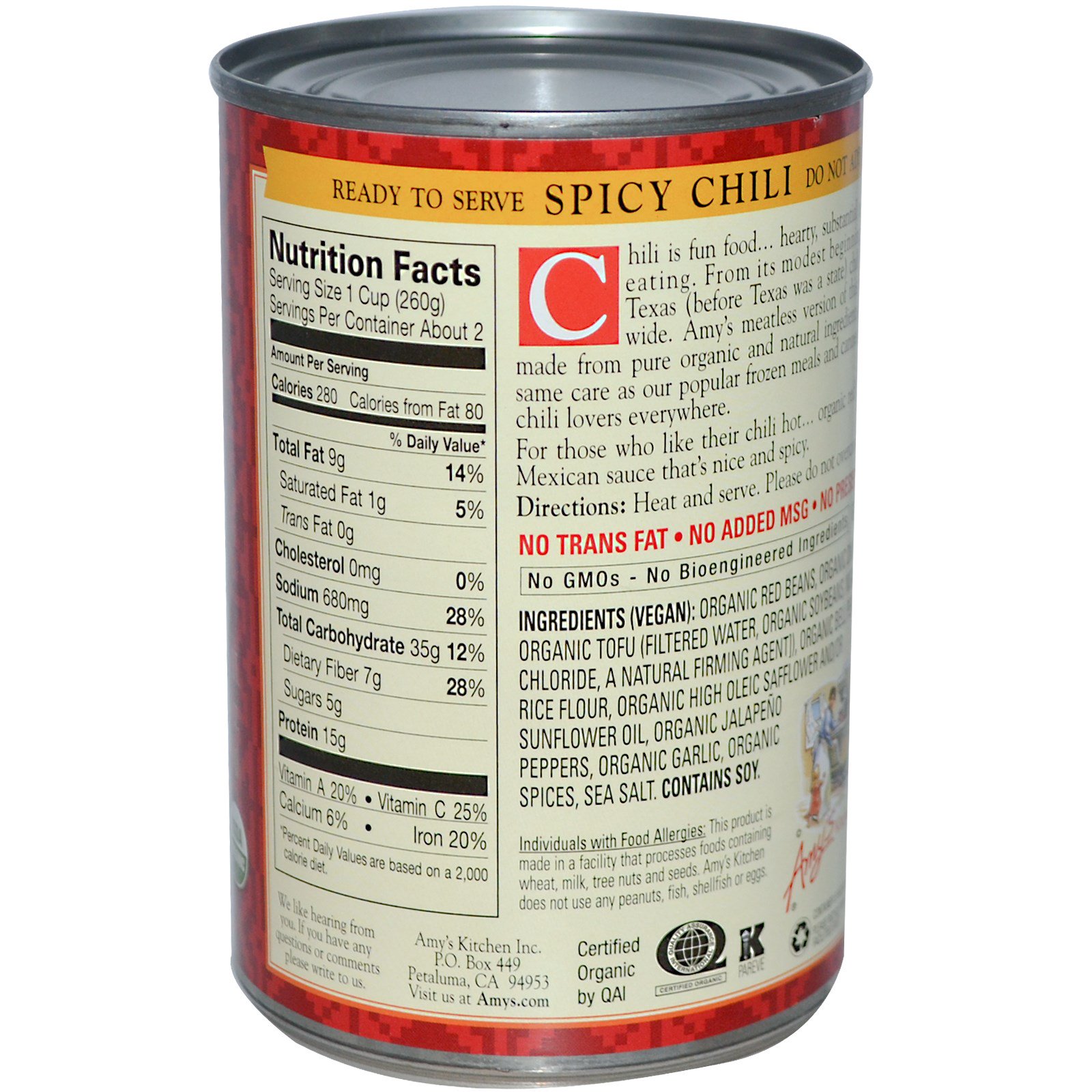 Chili é uma comida divertida… encorpada, substancial e muito boa. De seu início modesto em San Antonio, Texas (antes que o Texas fosse um estado), o chili se espalhou pelo mundo todo. A versão sem carne da Amy’s desse prato bem conhecido – feita com ingredientes naturais, puros e orgânicos, e preparada com o mesmo cuidado que nossas populares refeições congeladas e sopas enlatadas — vai satisfazer os amantes do chili no mundo todo.