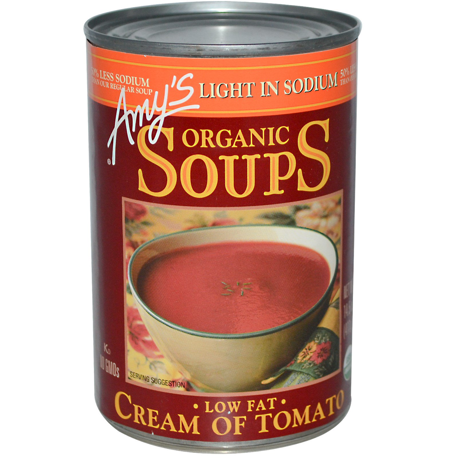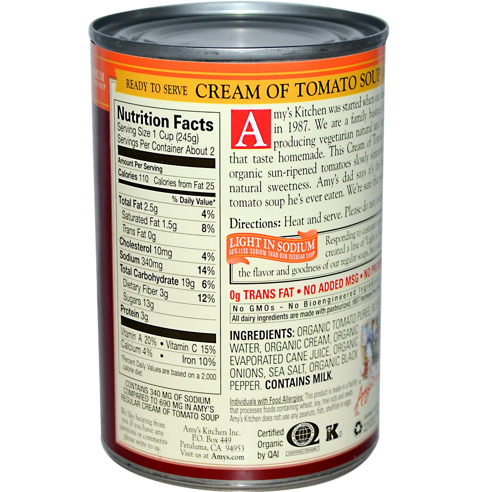 Contains 340 mg of sodium compared to 690 mg in Amy’s regular Cream of Tomato Soup.