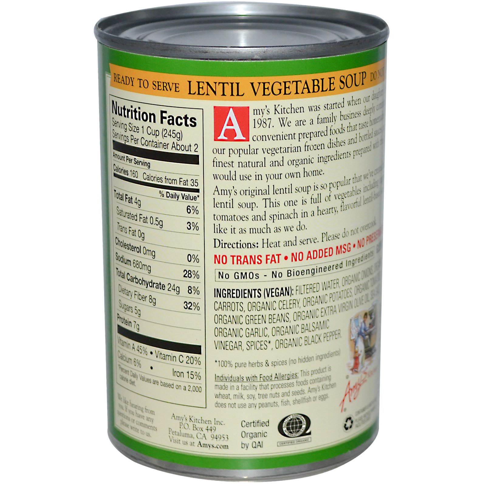 Amy’s original lentil soup is so popular that we’ve created another delicious lentil soup. This one is full of vegetables including organic green beans tomatoes and spinach in a hearty, flavorful lentil-based soup. We hope you like it as much as we do.