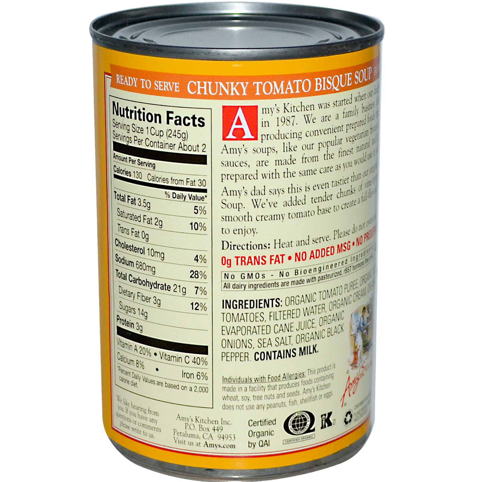Amy’s dad says this is even tastier than our original Cream of Tomato Soup. We’ve added ender chunks of vine-ripened tomatoes to a smooth creamy tomato base to create a full-flavored bisque you’re sure to enjoy.