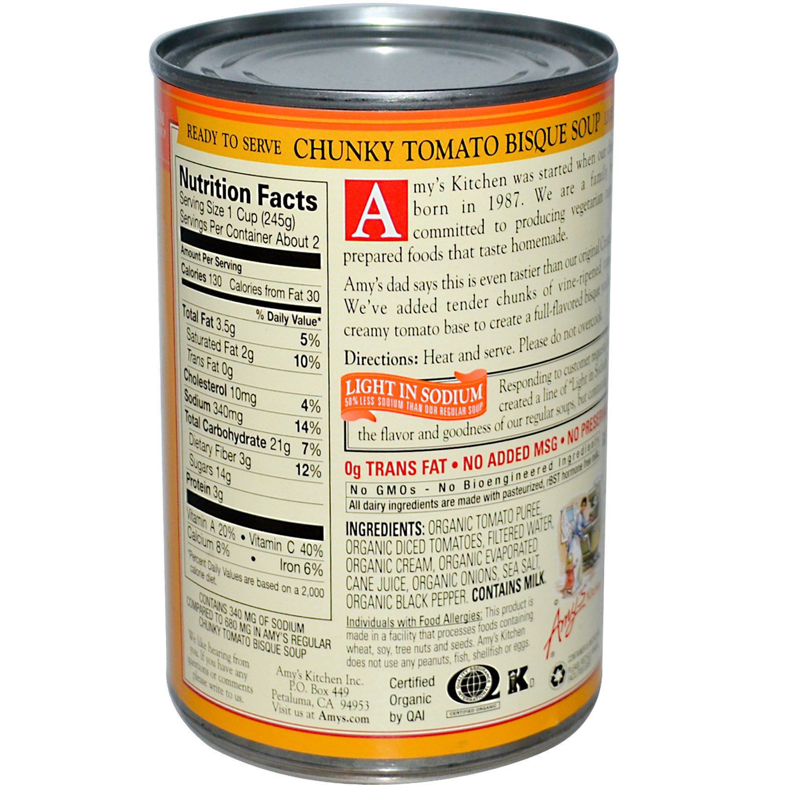 Contains 340 mg of sodium compared to 680 mg in Amy’s regular Chunky Tomato Bisque Soup.