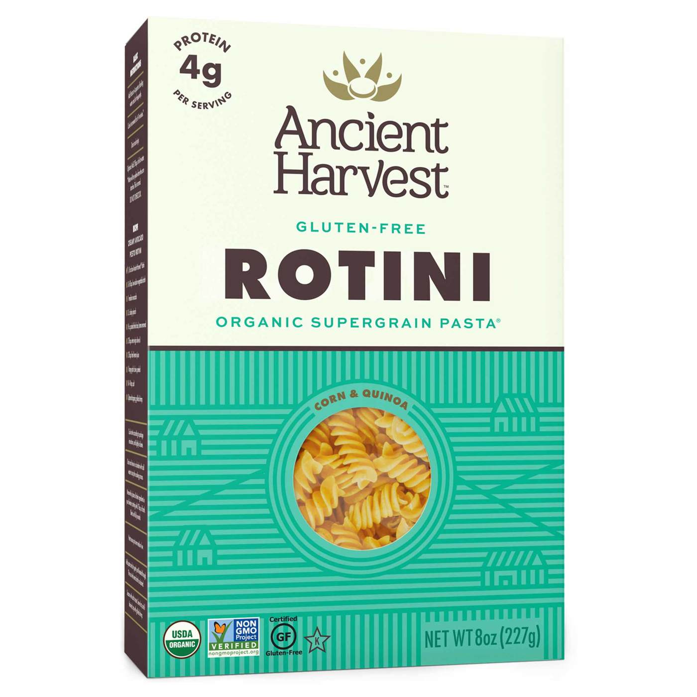 Ancient Harvest uses an organic blend of corn and quinoa flour to create the wonderful flavor and texture of Quinoa Gluten Free Rotini. Quinoa is the only grain that provides a complete protein that includes all 10 essential amino acids and each serving of this pasta has 4 g each of protein and fiber.