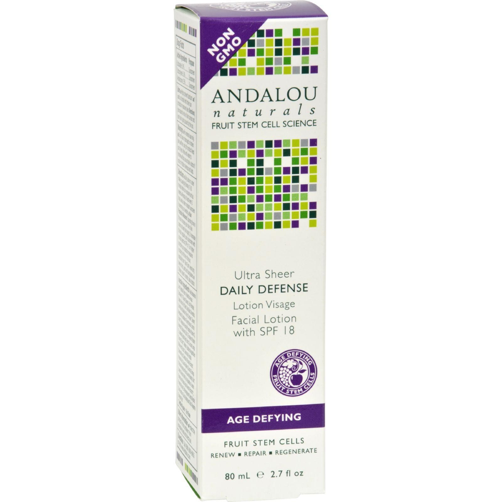 Andalou Naturals Ultra Sheer Daily Defense Facial Lotion with SPF 18 Description: Fruit Stem Cell Science Regenerating Fruit Stem Cells Renew Repair Regenerate pH Balanced Hypo-Allergenic Vegetarian and Cruelty Free 71% Certified Organic Ingredients Andalou Naturals Advanced Fruit Stem Cell Science renews skin at the cellular level, blending nature and knowledge for visible Age-Defying results. Renew Skin Vitality Repair Deep Dermal Damage Regenerate Healthy Cells BioActive 8 Berry Complex provides a potent portfolio of super antioxidants to combat environmental stressors, support cell turnover, increase collagen and elastin, and strengthen dermal immunity. BioActive 8 Berry Complex Certified Organic Acai Berry Aronia Berry Bearberry Bilberry Black Elderberry Goji Berry Rosehips Berry Sea Buckthorn Berry Organic Aloe Vera polysaccharides best prepare, soothe, oxygenate and replenish, providing the optimal dermal delivery for the active ingredients. Perfect for sensitive skin, this ultra sheer lotion provides essential moisture with proven UVA/UVB sun protection. Fruit Stem Cells and BioActive 8 Berry Complex diminish photo-aging and stimulate healthy cell renewal for age-defying benefits. RESULTS: Age-Defying Free Of Sulfates, GMO, petrochemicals, phthalates, parabens, synthetic fragrance, colors and preservatives. Disclaimer These statements have not been evaluated by the FDA. These products are not intended to diagnose, treat, cure, or prevent any disease.