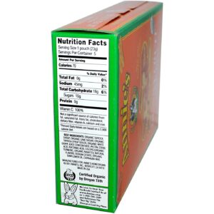 The playful Organic Bunny Fruit Snacks are shaped like bunnies and made with real fruit juice. They contain no sabores artificiais, colous ou conservantes. All of the ingredients are from non-GMO sources and are vegan friendly. Each pouch contains 100 percent of your recommended dia intomar of vitamin C.