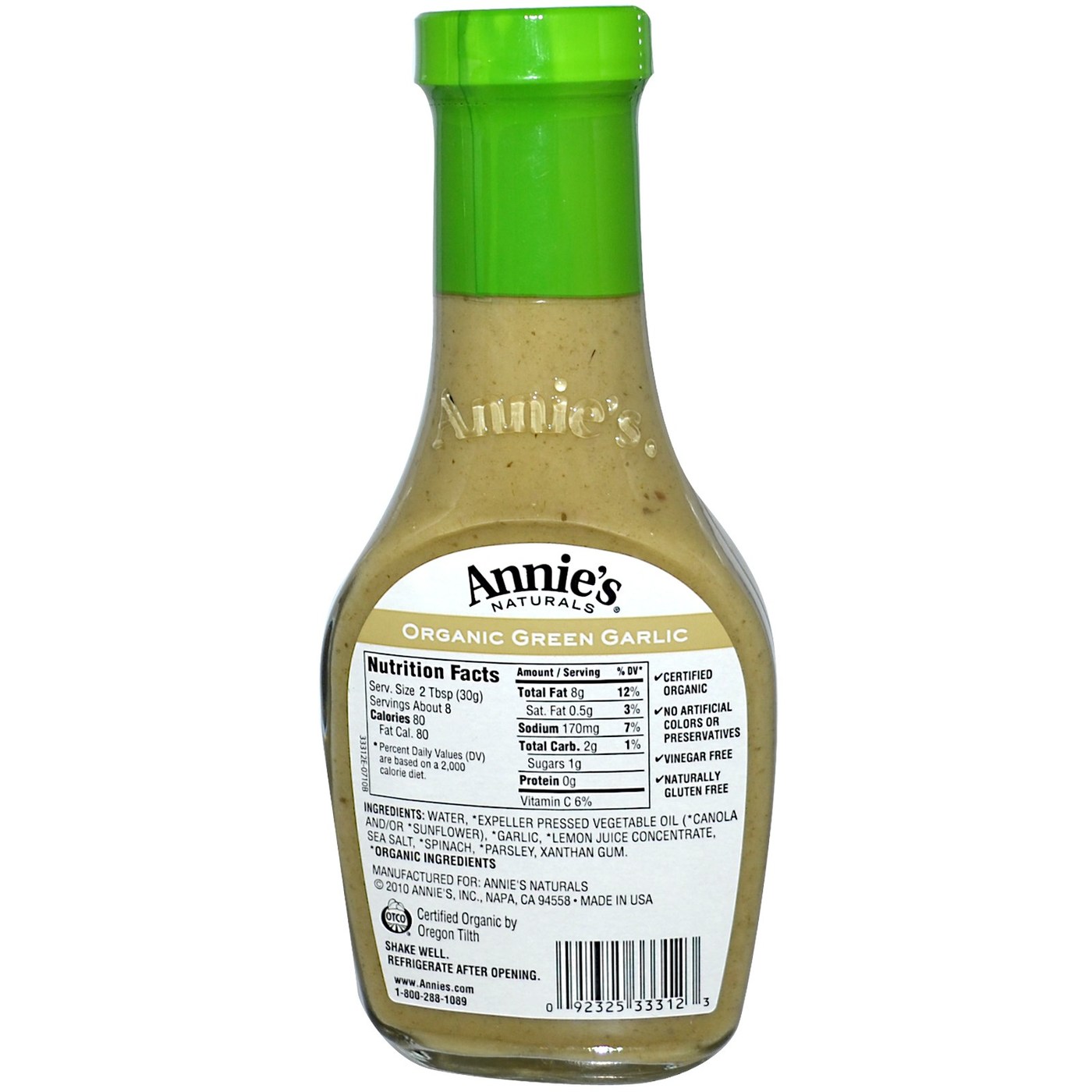 Annie’s Homegrown’s Organic Garlic Green Dressing is made with only the finest natural and organic ingredients, including organic lemon juice, spinach, parsley and garlic. The flavor of this dressing is bright and fresh and tastes delicious on a cold salad or can be used to enhance the taste of proteins as a marinade.
