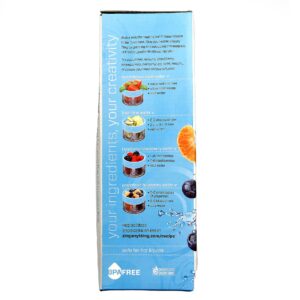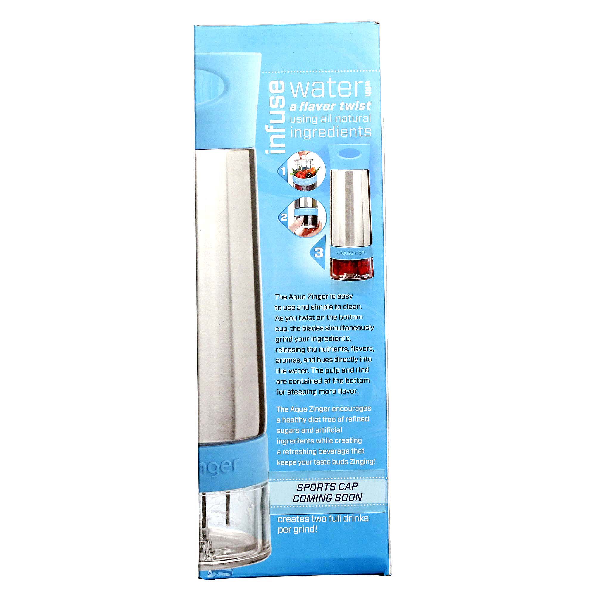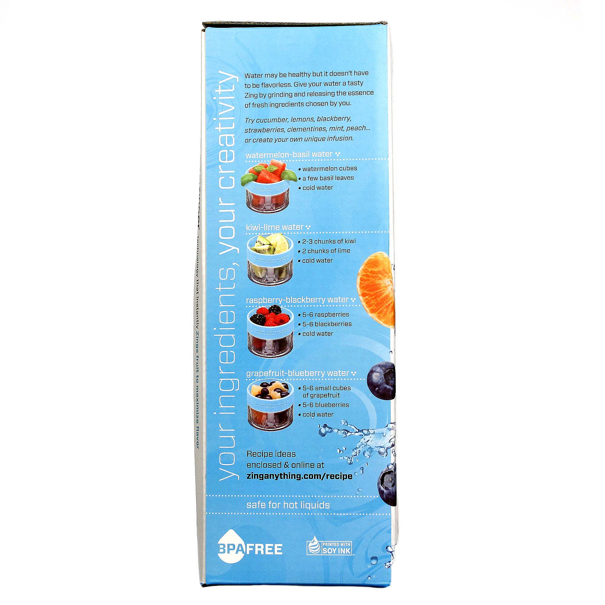 Notas: Made with BPA/EA free Tritan plastics from Eastman, 18/8 stainless steel (spout and blades) and rubber (base).The recommended Aqua infusion shelf life is three days for all beverages, if refrigerated. If you plan to consume your Zing creation with a 12-hour period, no chilling is required. Aqua Zings typically produce more than one drink per grind, however allowing some time for steeping will enhance the flavor, especially on multiple fill-ups. In order to return to a tasty concentration, we recommend adding new ingredients after two servings have been enjoyed (or 40 fl oz). Empty the Zinger completely, discard used ingredients and clean before Zinging a new tasty batch of flavored water. Aqua Zings have more robust flavors after 20 minutes of steeping and shaking is key. Make sure to use fully ripened ingredients. Harder ingredients such as granny smith apples will work, but allow for longer steeping times (i.e. overnight).