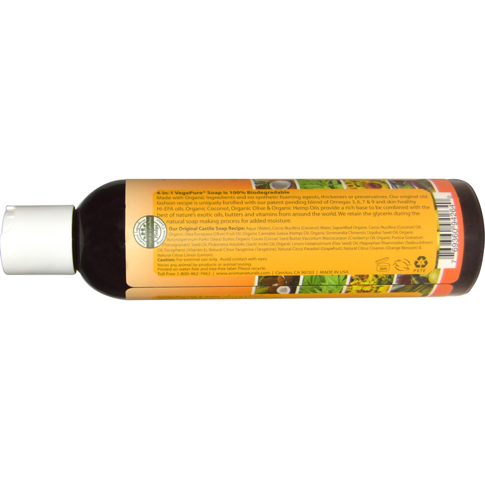 Purified water (aqua), organic cocos nucifera (coconut) water*, organic aloe barbadensis (aloe) inner leaf juice*, saponified cocos nucifera (coconut) oil, glycerin (kosher), potassium hydroxide (doesn’t remain after saponification), organic olea europeae (olive, 3 & 6) fruit oil*, organic helianthus annuus (sunflower) seed oil*, organic simmondia chinensis (jojoba) seed oil*, organic butyrospermum parkii (shea) butter*, organic theobroma cacao (cocoa) seed butter*, magnesium chloride (with trace minerals), caprylic/capric triglyceride, citrus sinensis (orange) butyrospermum parkii (shea) butter*, organic theobroma cacao (cocoa) seed butter*, magnesium chloride (with trace minerals), caprylic/capric triglyceride, citrus sinensis (orange) essential oil, vaccinium macrocarpon (cranberry, 3,6 & 9) seed oil, organic punica granatum (pomegranate, 5) seed oil*, organic plukenetia volubilis (sacha inchi, 3, 6, & 9) seed oil*, organic linum/sitatissimum (flax, 3 & 6) seed oil*, organic hippophae rhamnoides (sea buckthorn, 7) oil*, guar hydroxypropyltrimonium chloride, tocopherol (vitamin E), diheptyl succinate, leuconostoc/radish root ferment filtrate, citrus reticulata (tangerine) oil, citrus paradisi (grapefruit) oil, capryloyl glycerin/sebacic acid copolymer, citric acid & citrus limon (lemon) peel oil.