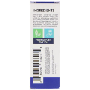 Simmondsia chinensis (jojoba oil), citrus sinensis (sweet orange oil), lavendula angustifolia/lavendula hybrid blend (lavender oil/lavandin oil), eucalyptus globulus (eucalyptus oil), rosmarinus officinalis (spanish rosemary oil), natural linalool.