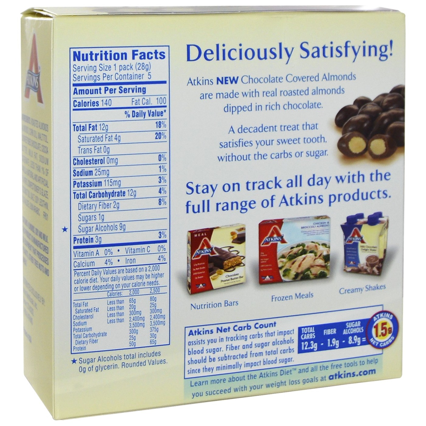 ch serving of Atkins Chocolate Covered Almonds has only 140 calories!