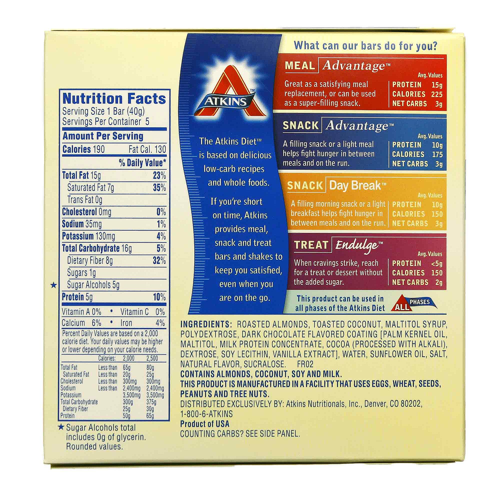 In accordance with the Atkins philosophy, these bars are low in carbohydrates while providing 10 g of protein along with vitamins, minerals and lots of fiber. Because the fiber bulks with water, the Advantage Bar also helps you consume less calories throughout the day by keeping your stomach full and your energy up. Enjoy these bars from Atkins as a snack to help you get more protein into your diet and reach your weight loss goals.