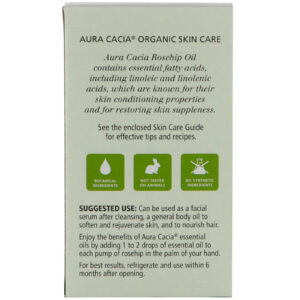 Aura Cacia Rosehip Oil contém ácidos graxos essenciais, incluindo ácidos linoléicos e linolênicos, conhecidos por suas propriedades de condicionamento da pele e para restaurar a flexibilidade da pele.