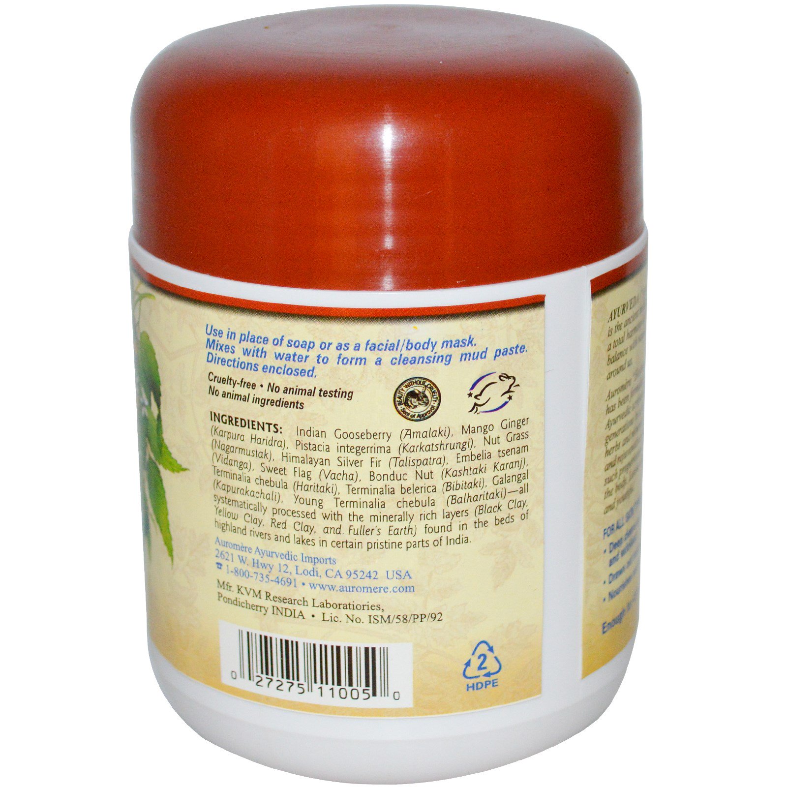 O banho de lama Auromere, herbomineral e rejuvenescedor, é formulado seguindo as escrituras Ayurvédicas antigas e passado por gerações em uma única linhagem familiar. Ervas e minerais especialmente slecionados, notáveis por suas qualidades e benéficas e rejuvenescedoras, foram cobinados em proporções tais que purificam, limpam e estimulam o organismo. Deixa a pele extraordinariamente macia, suave e rejuvenescida.