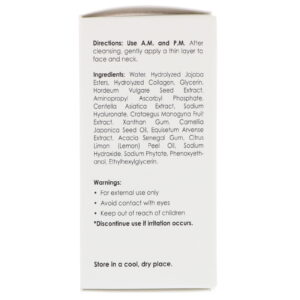 Water, hydrolyzed jojoba esters, hydrolyzed collagen, glycerin, hordeum vulgare seed extract, aminopropyl ascorbyl phosphate, centella asiatica extract, sodium hyaluronate, crataegus monogyna fruit extract, xanthan gum, camellia japonica seed oil, equisetum arvense extract, acacia senegal gum, citrus limon (lemon) peel oil, sodium hydroxide, sodium phytate, phenoxyethanol, ethylhexylglycerin.
