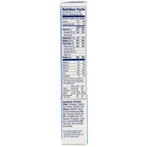Queijo: queijo cheddar (leite pasteurizado cultivado, sal, enzimas), leite seco sem gordura, soro de leite integral, sal, fosfato dissódico, ácido láctico, leite integral cultivado, ácido cítrico, dióxido de silício (antiaglutinante).