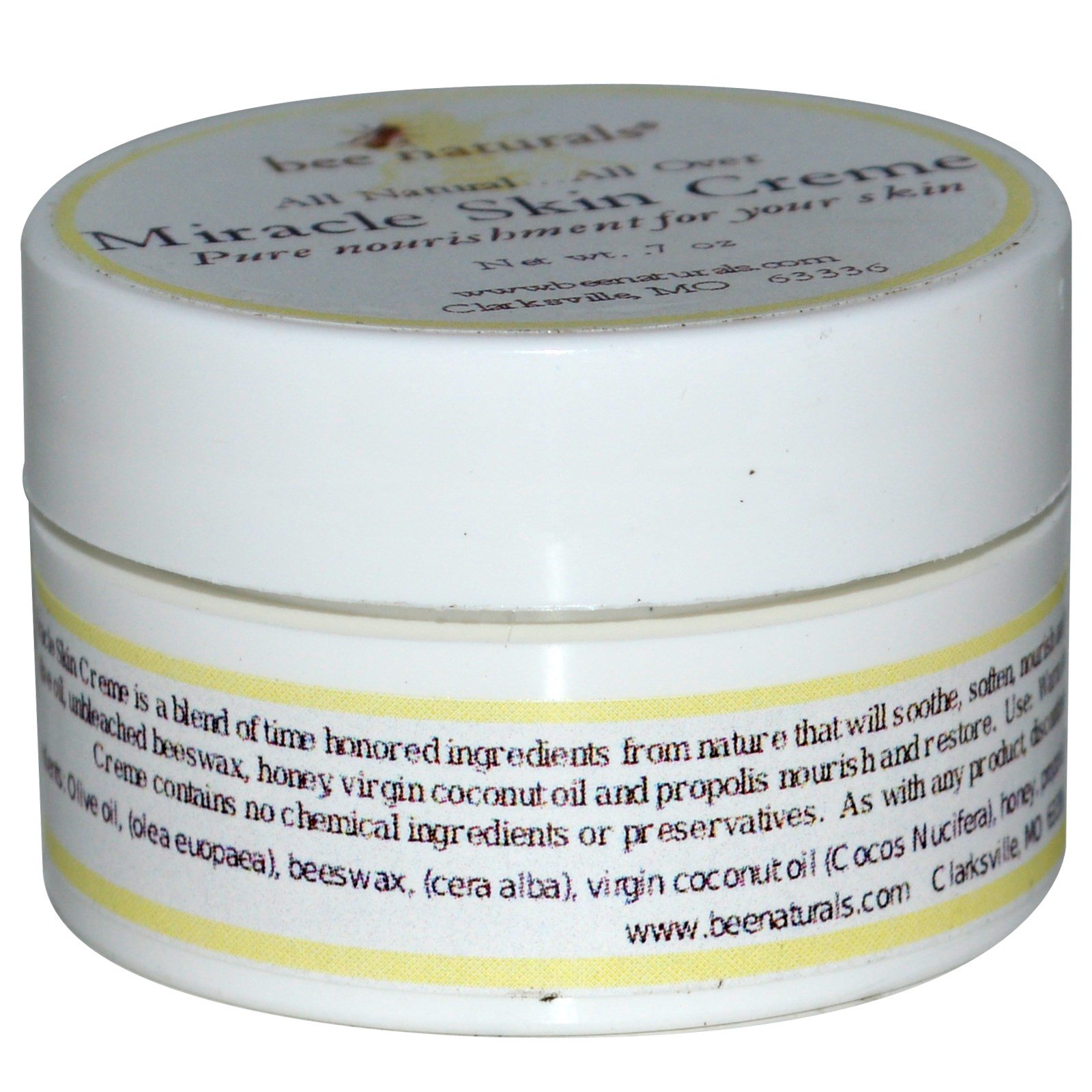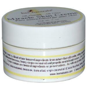 Bee Naturals Miracle Skin Cream is a blend of time honored ingredients from nature that will soothe, soften, nourish and pamper your skin. It can be used for the face, lips, hands…anywhere your skin needs some TLC. Pure olive oil, unbleached beeswax, honey, virgin coconut oil and propolis nourish and restore.
