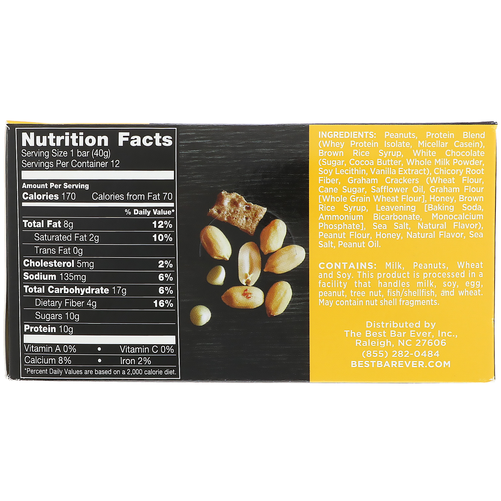 Peanuts, protein blend (whey protein isolate, micellar casein), brown rice syrup, white chocolate (sugar, cocoa butter, whole milk powder, soy lecithin, vanilla extract), chicory root fiber, graham crackers (wheat flour, cane sugar, safflower oil, graham flour [whole grain wheat flour], honey, brown rice syrup, leavening [baking soda, ammonium bicarbonate, monocalcium phosphate], sea salt, natural flavor), peanut flour, honey, natural flavor, sea salt, peanut oil.